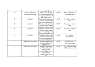 This document contains notes from filming a short film. It lists 27 shots taken from the main camera and 13 shots from a second camera. For each shot, it provides the shot type, quality issues, duration, and a note on whether the shot will be used in the final film. Many shots were unusable due to issues like poor quality, people or equipment in frame, or being practice shots. A few shots from each camera were selected for having the right action and quality needed.
