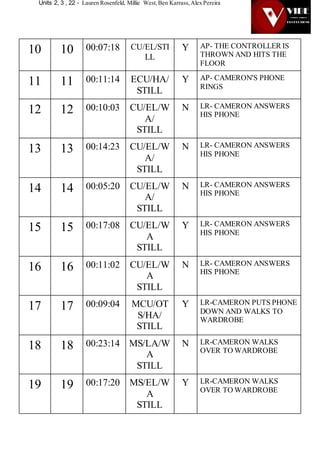 The document is an edit decision list detailing various camera shots for a film segment featuring characters Cameron and Ethan. Each entry includes shot numbers, camera angles, take quality, and brief descriptions of actions, primarily focused on scenes of the characters playing video games and exploring a house. The list emphasizes the progression of events, from playing games to leaving the house and interacting with their surroundings.