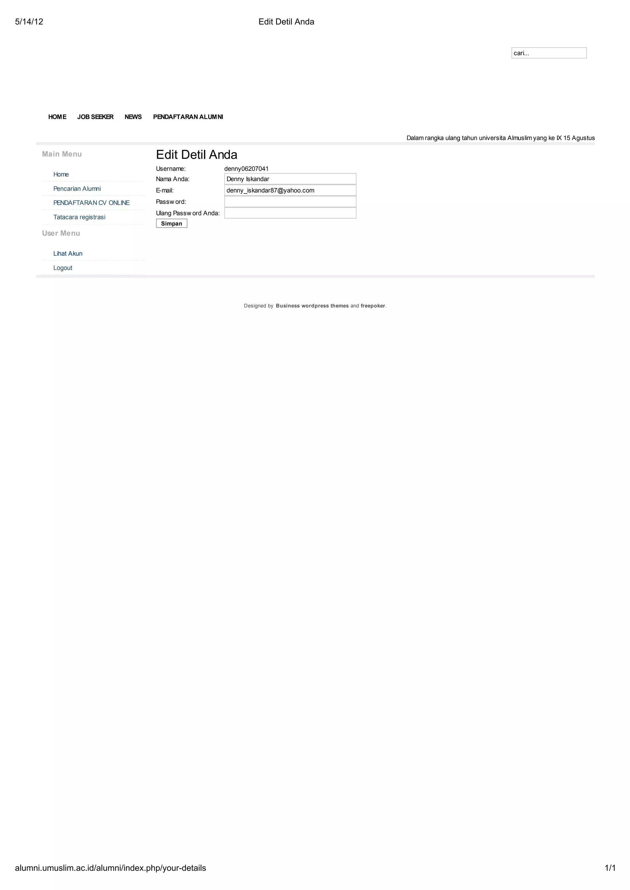 Universitas Almuslim akan merayakan ulang tahun ke-9 pada tanggal 15 Agustus 2012. Dokumen ini memberikan informasi tentang halaman profil pengguna untuk mengedit detail akun seperti nama, email, dan kata sandi. Pengguna dapat menyimpan perubahan yang dilakukan pada profilnya.