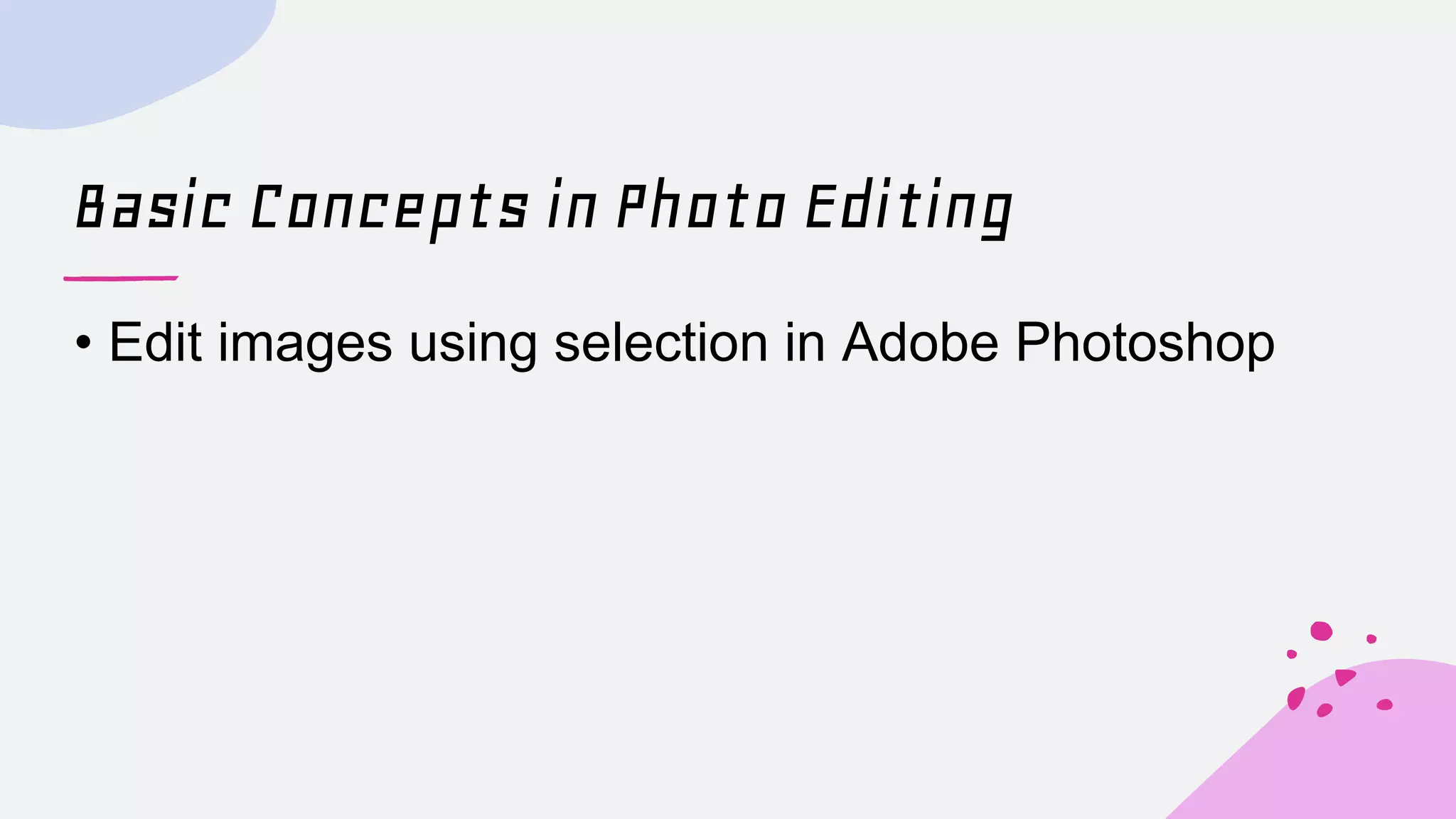 This document provides instructions for selecting areas in images using Photoshop. It discusses the basics of making selections with tools like the rectangular marquee and lasso tools. It also covers selecting by color using the eyedropper, color range, and magic wand tools. The document describes how to select irregular areas using the lasso and pen tools and how to modify selections by moving, inverting, adding to, subtracting from, or intersecting with existing selections.