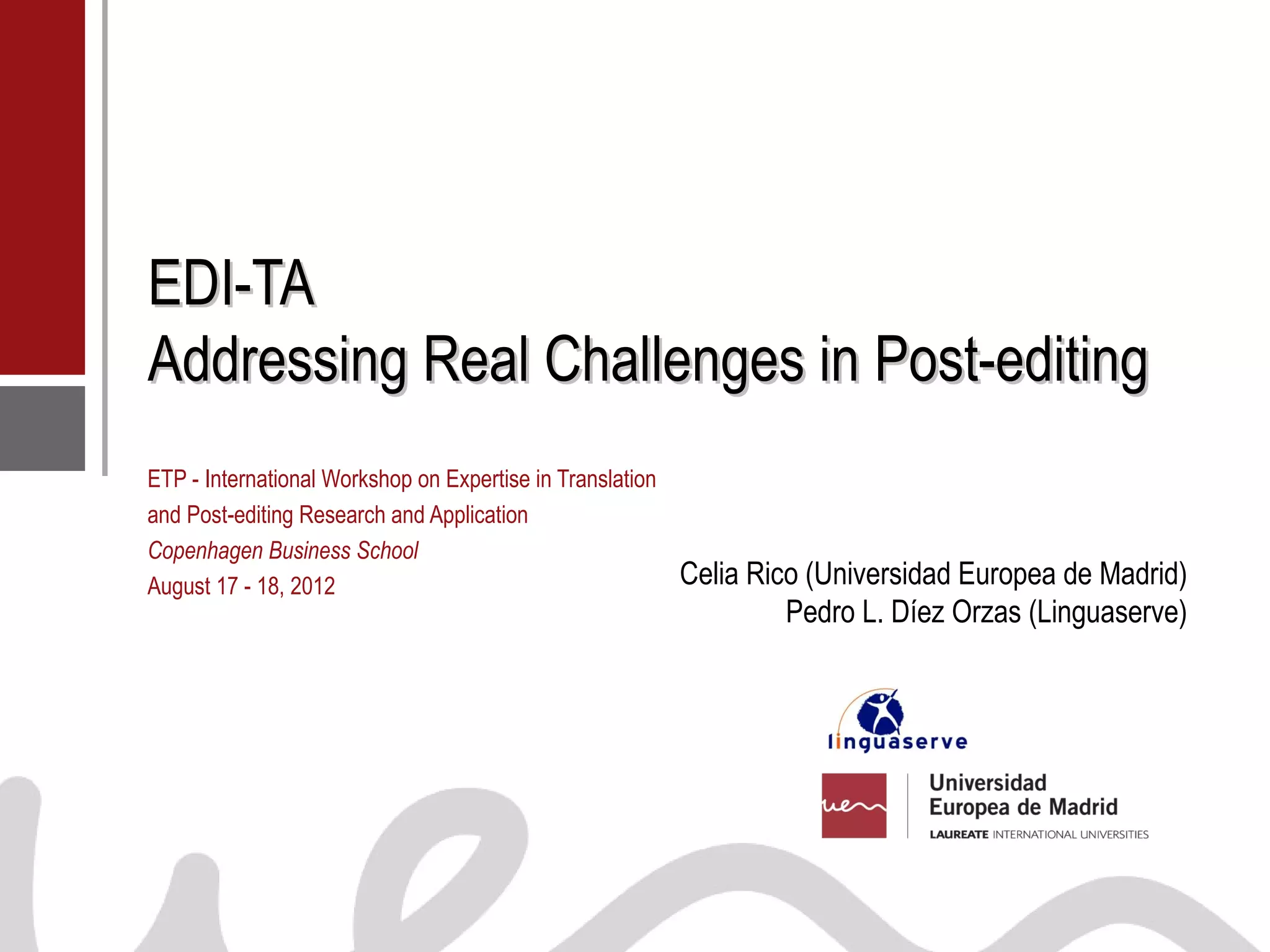 The document outlines the objectives and methodology of the edi-ta project, which focuses on improving post-editing processes for machine translation. It aims to define a post-editing tool, train post-editors, and analyze economic impacts, utilizing a structured approach for error analysis and decision-making. The project involves a practical orientation with a focus on enhancing productivity and quality in translation workflows.