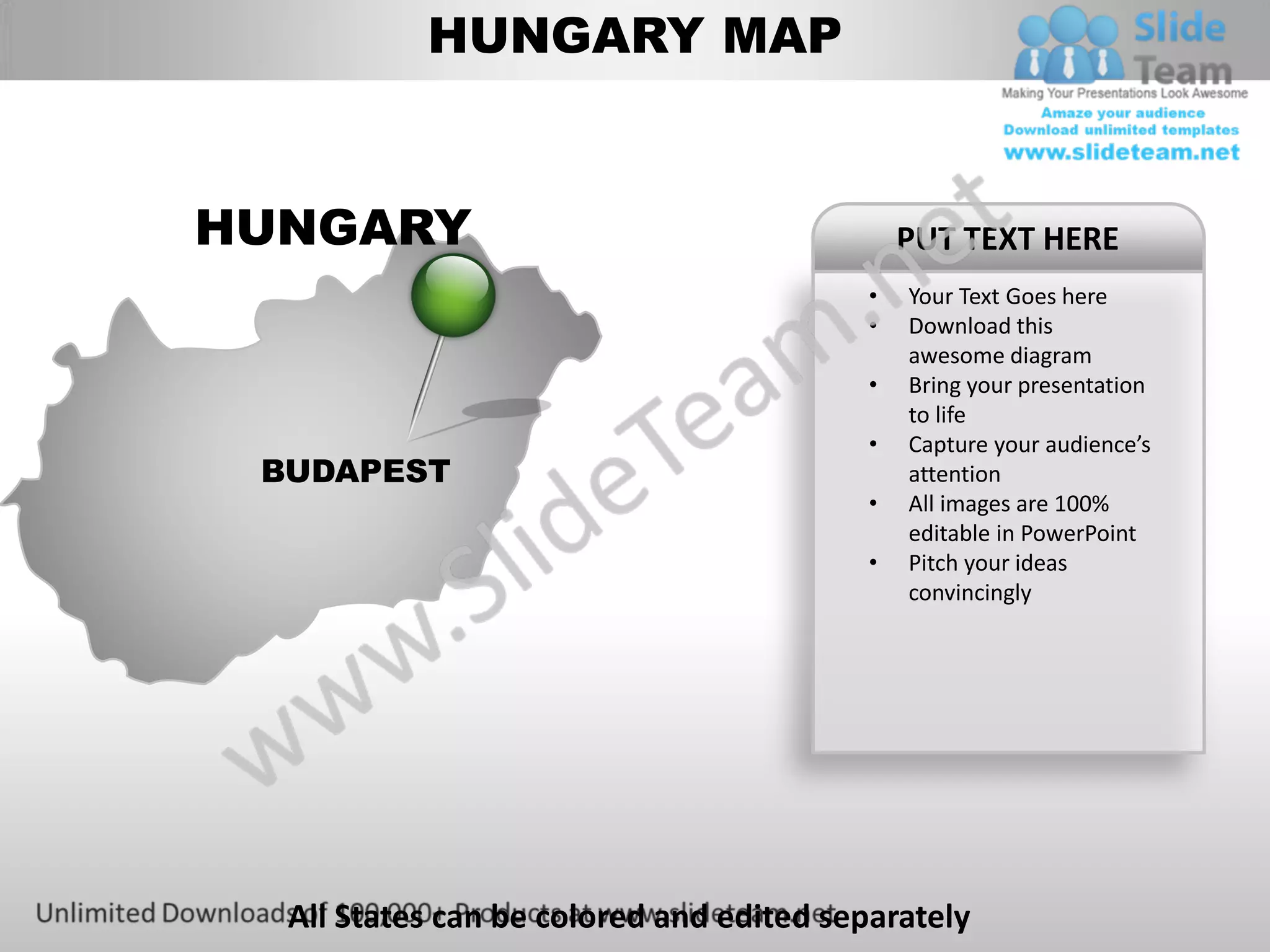 This document provides instructions for editing a Hungary map diagram in PowerPoint. It includes directions for changing the color of shapes on the map, resizing the map, and inserting text boxes to add names or labels. Users can customize the map by editing individual states or regions. The map is fully editable and can be modified to enhance PowerPoint presentations.