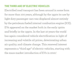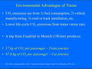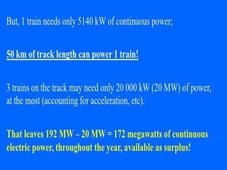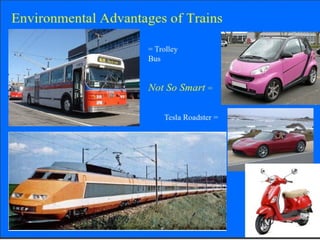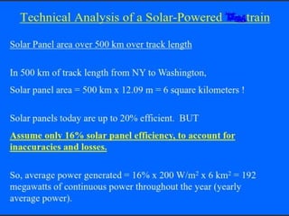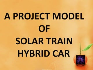 The document proposes a model for a solar train hybrid car. It first provides background on the history of transportation and rail transport. It then describes how a solar train works, using solar panels to power electric propulsion and reducing pollution. Next, it discusses electric cars, how they are powered by electric motors and batteries, and the benefits they have over gas-powered cars like reduced emissions. It concludes that solar trains can significantly reduce electricity use and greenhouse gas emissions.