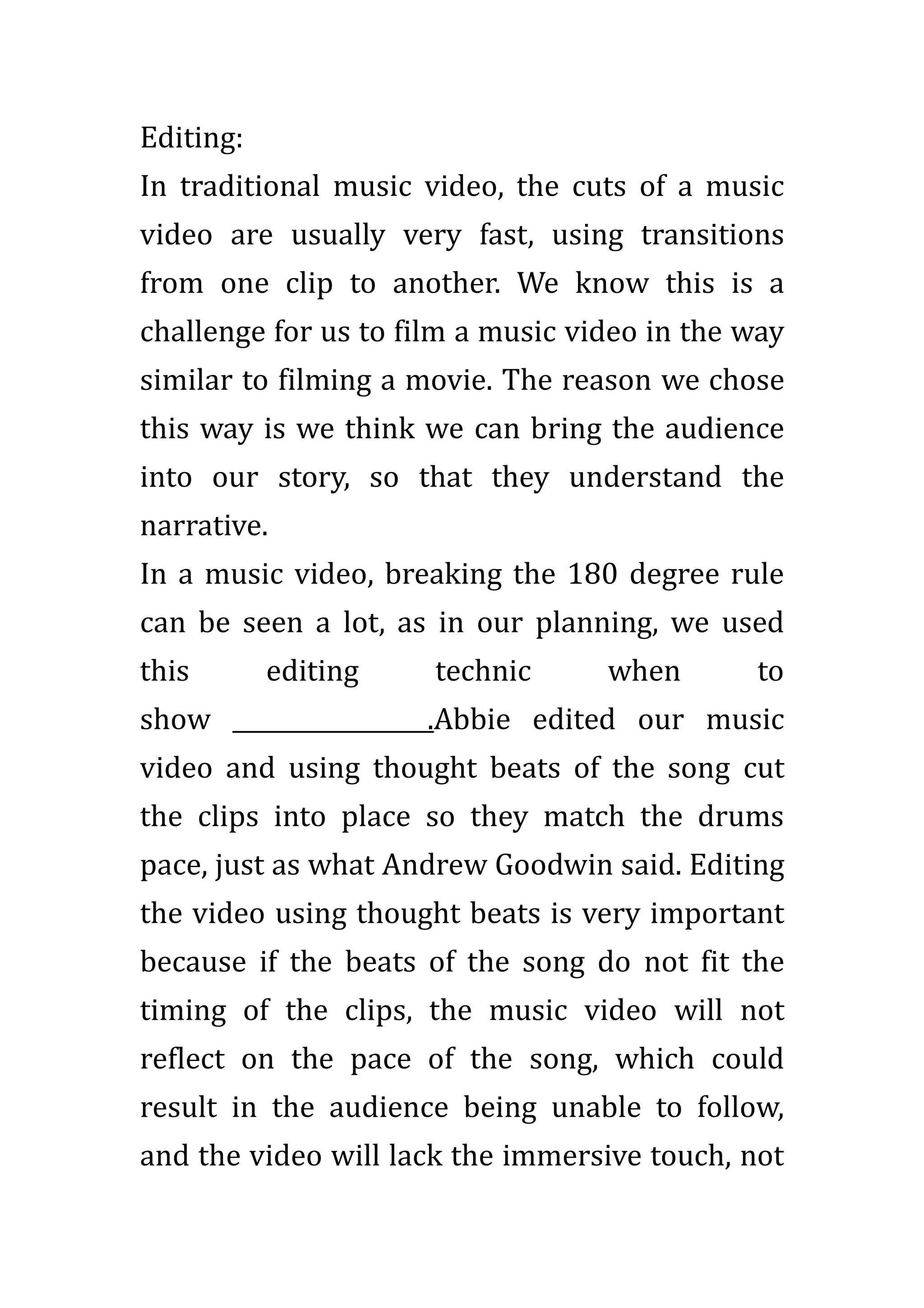 The document discusses editing techniques for music videos. It explains that music videos traditionally use fast cuts between clips to transition. The author chose to film their music video more like a movie to immerse the audience in the story. Their editor Abbie cut the clips to match the drum beats of the song, which is important so the timing matches and the audience can follow. The pace of editing for indie rock videos is usually slower than other genres. Their music video was a hybrid of indie rock and pop styles due to the song's pace. Candle overlays and storytelling editing techniques were used. Following conventions makes the music video more creative and attractive.