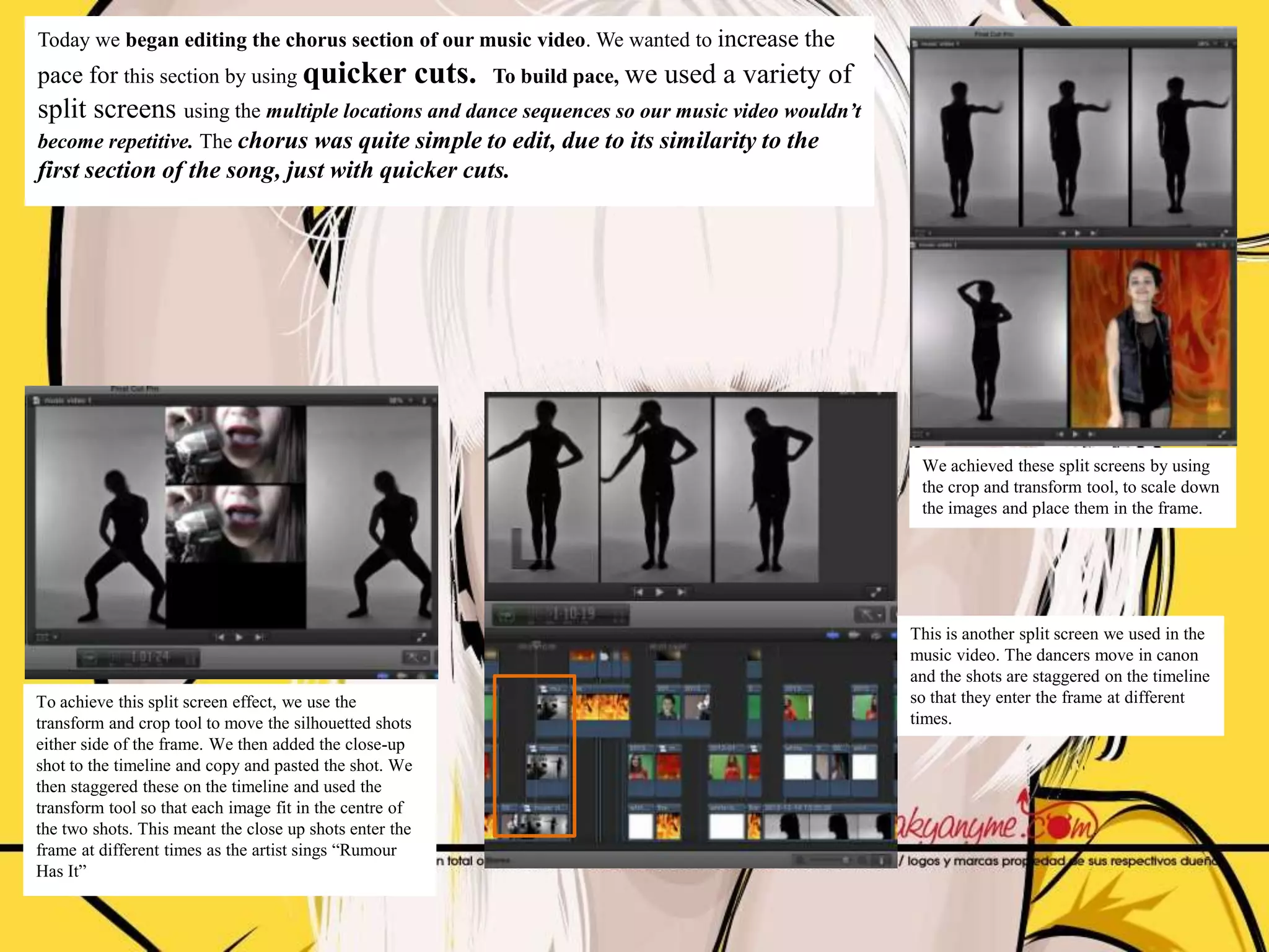 We edited the chorus section of a music video by using quicker cuts and split screens between multiple locations and dance sequences to avoid repetition. We struggled to join the chorus to the second verse due to a gap in the music but found a solution by cross-cutting shots of the artist turning her head matched to the beat. We were able to add additional sequences earlier than planned and edited shots together using techniques like keyframes and speed adjustments to make the dance sequences look impactful.