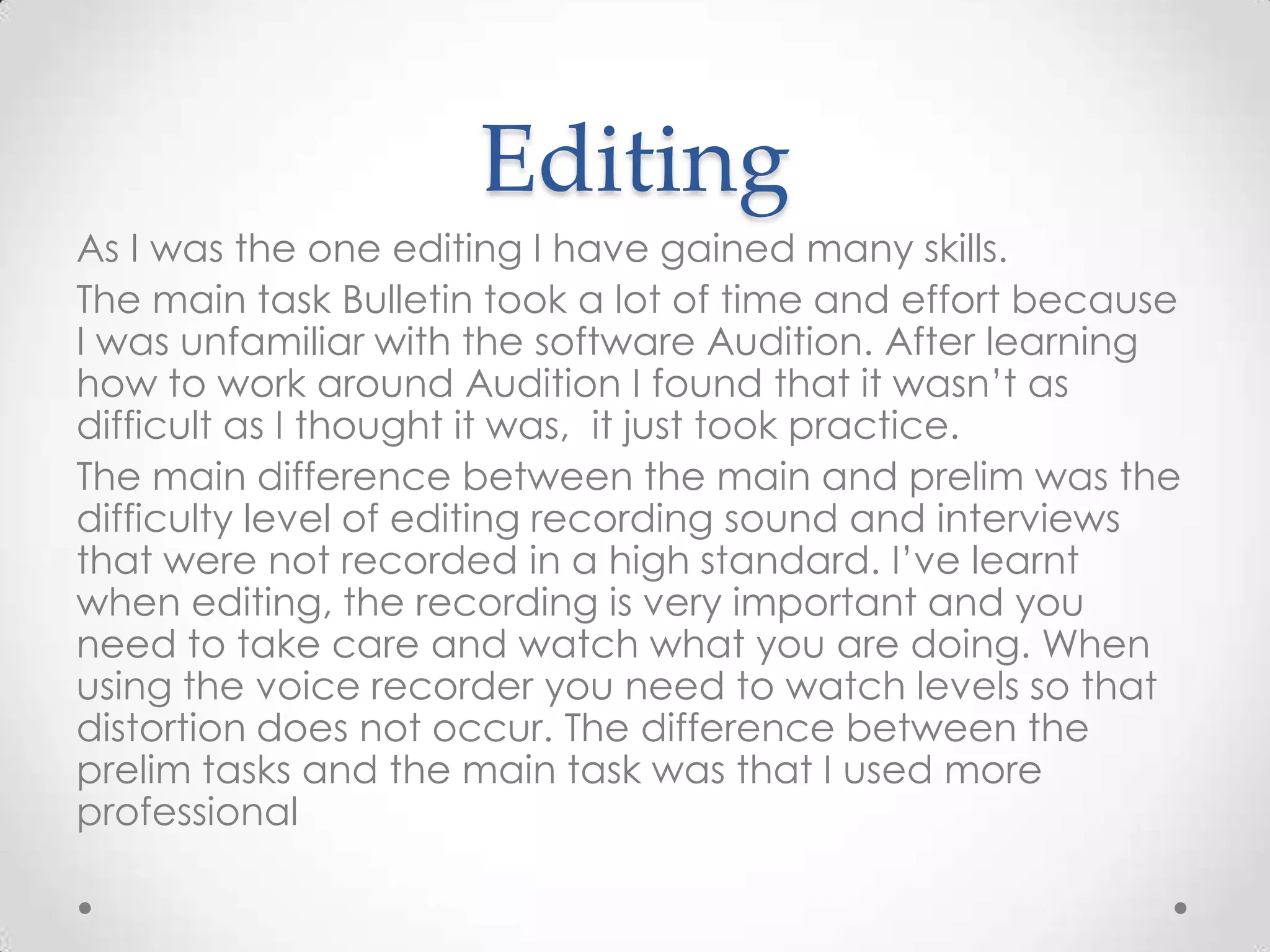 The writer gained editing skills by working on a Bulletin task that required learning how to use the Audition software. While initially unfamiliar with Audition, the writer found it became less difficult with practice. The main task differed from preliminary tasks in editing more challenging recordings of lower audio quality interviews and sounds. The writer learned the importance of recording quality for editing and of monitoring levels to avoid distortion when using a voice recorder.