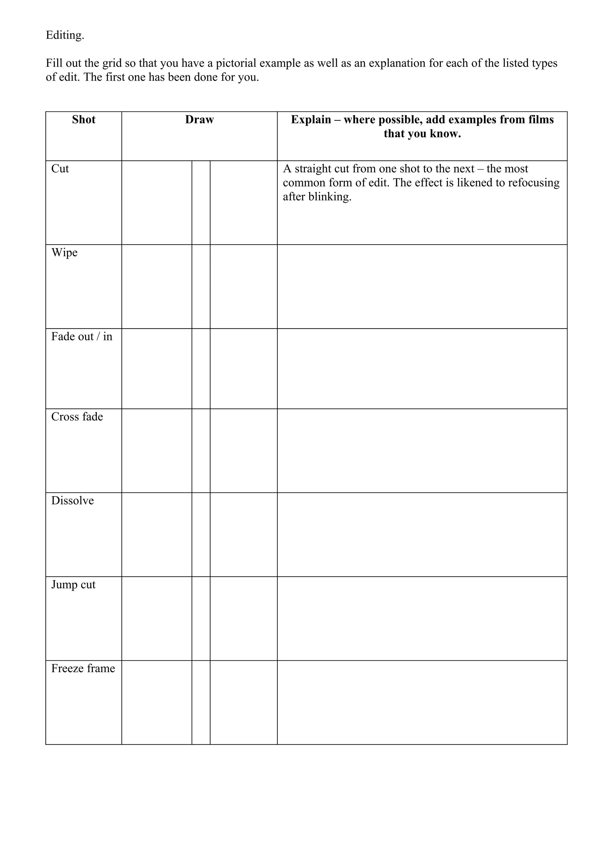 The document provides a grid for listing and explaining different types of edits that can be used in filmmaking. It gives an example of a cut as the most common form of edit, likening its effect to refocusing after blinking. The grid is meant to be filled out with pictorial examples and explanations for each type of edit listed, including wipes, fades, cross fades, dissolves, jump cuts, freeze frames, changes in motion like slow motion and fast motion, shot/reverse shot editing, bridging shots, cutaways, juxtaposition, and montages.