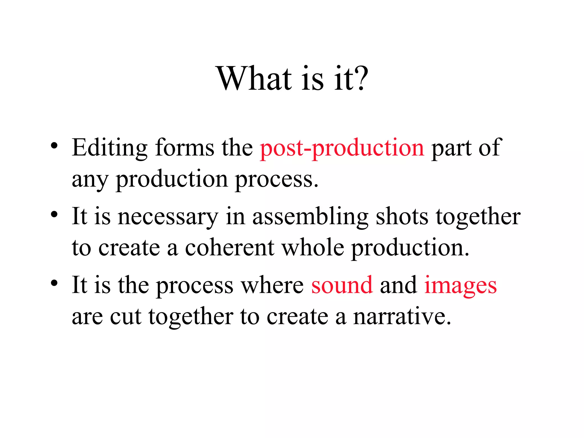 Editing is the process of assembling shots together to create a coherent narrative for any production. Shots are organized through transitions and edited based on duration to manipulate emotions and understanding. Continuity ensures smooth transitions between shots through matching actions or events, while rhythm is created by the pace of the cuts. Different transitions aid the narrative and audience experience.