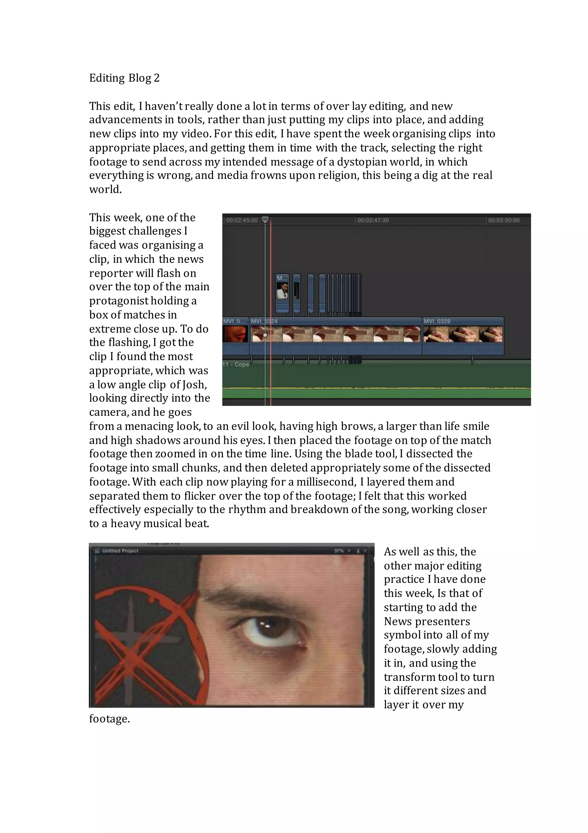 This edit focuses on organizing clips and selecting footage that conveys a message of a dystopian world where media disapproves of religion. The editor spent the week arranging clips in the proper order and timing them to match the track. One challenge was flashing a news reporter clip over footage of a character holding matches, which was achieved by dissecting the reporter clip into small chunks and layering them to flicker to the rhythm of the song. Additional editing techniques included slowly adding a news symbol to footage using transforms and effects like static, earthquake, and bad TV to match existing distortions.
