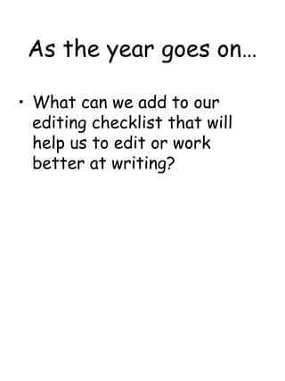 The document provides an editing checklist for students to review before showing their writing to a teacher. The checklist includes checking for proper punctuation and capitalization, re-reading work aloud, attempting spellings of unknown words and using references to check, substituting synonyms, using appropriate language resources, and words from a word wall. It asks students what else could be added to the checklist to help with editing and improving writing.