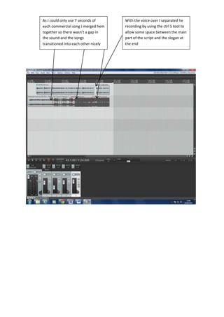 The creator merged 7 seconds of commercial songs together to avoid gaps in the sound and allow the songs to transition smoothly into each other. They separated the voice over recording by using the ctrl S tool to leave some space between the main part of the script and the concluding slogan. The document discusses techniques for editing together music and a voice over recording for a commercial.