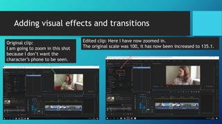 This document contains a log of edits and additions made in Adobe Premiere Pro to a film project. It describes adding visual effects like zooming and fading transitions, importing and syncing audio files, adding title sequences and credits, and exporting the final video in H.264 format at 1080p for uploading to YouTube. The log provides technical details on the editing processes used to produce and prepare the short film.