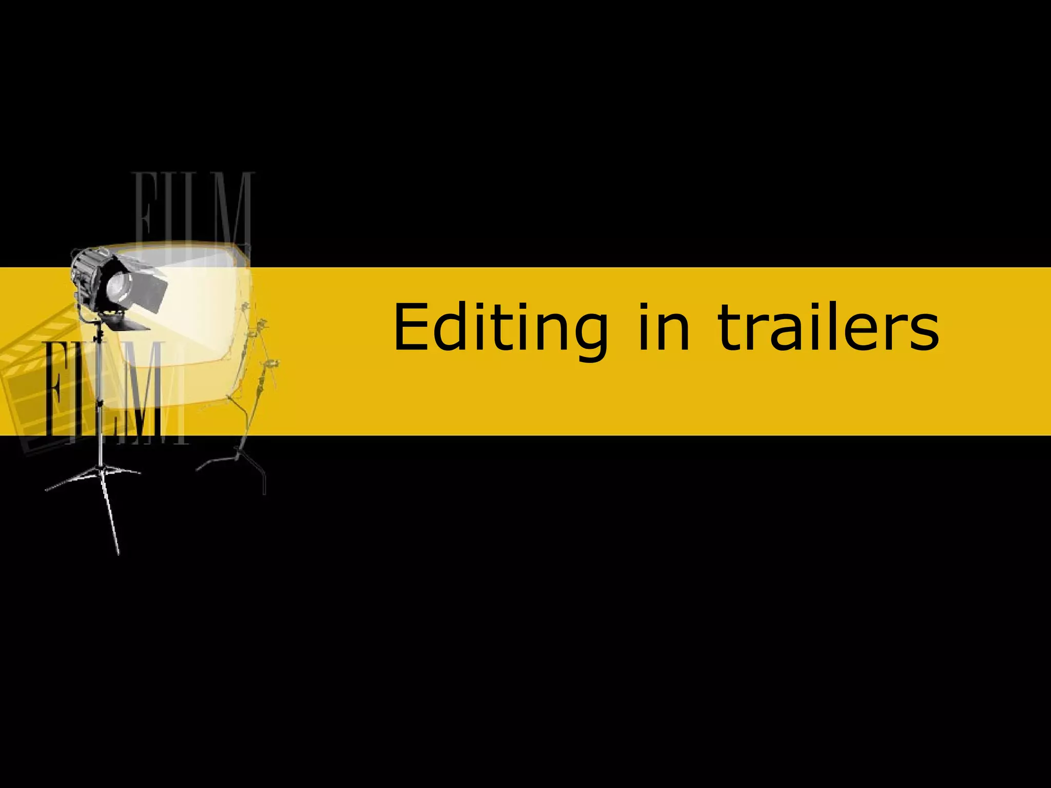 The document discusses various editing techniques used in film trailers, including continuity editing, montage, and discontinuity editing. It explains how continuity editing maintains spatial and temporal relationships between shots through techniques like the 180-degree rule. Montage can compress events through a series of short shots. Discontinuity editing can create narrative ambiguity by omitting context between shots. Overall, the document provides an overview of editing techniques that can be used to engage audiences and create narrative tension in film trailers through the strategic arrangement of shots.