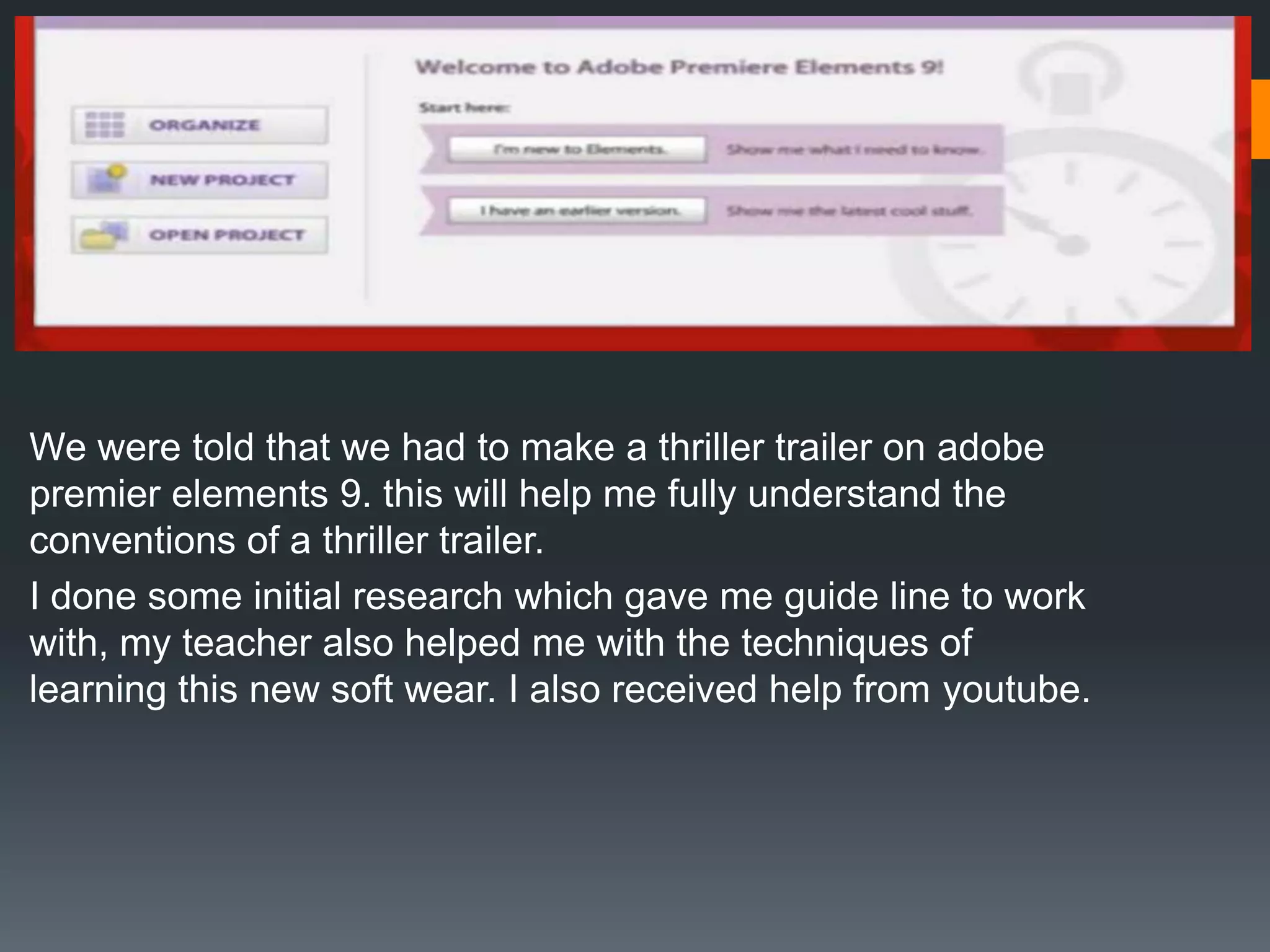 I edited a thriller trailer in Adobe Premier Elements 9 following Todorov's narrative theory. I began with an establishing shot of a character walking into an apartment building, then cut to them walking up stairs using fade transitions. Subsequent shots included characters smoking and looking distressed, a confrontation between parents, and the discovery of a threatening letter. These established the disruption of equilibrium. Later shots showed characters running away in long takes without tripods to imply being chased. Intertitles with drifting text were used to connect scenes and inform the story. The trailer concluded by returning to a new sense of equilibrium with slowed music and intercut scenes of characters looking for help.