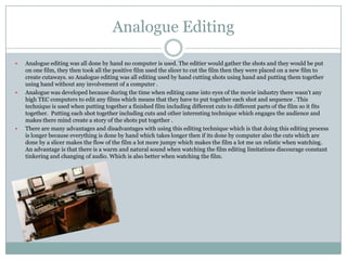 Analogue editing involved physically cutting film strips and splicing shots together by hand without computers. This process was time-consuming but resulted in a natural flow. Digital editing uses computers to seamlessly integrate shots, effects, and audio for higher quality films. It allows for easier experimentation than analogue editing. In-camera editing captures multiple angles and variations of scenes within a single take.