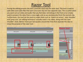 The document discusses various tools used in editing a music video in Adobe Premiere Pro 2.0. It describes the razor tool, which splits video and audio clips into separate pieces, and how it was used to cut out unwanted parts and create different shot types. It also discusses the timeline, which separates the video, audio, and time elapsed. Visual effects were used to alter exposure and contrast to make monsters look scarier. Titles were added with lettering over a black background to display the song name. Files were stored on the left side labeled by type, frame rate, and start time.