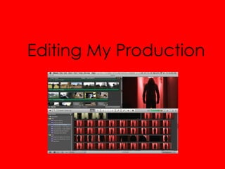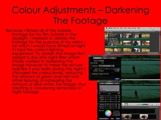 The document discusses various color adjustments and editing techniques used to alter footage for a video production. It describes darkening outdoor daylight footage to look like night scenes, adding red and blue color filters to achieve different lighting effects, using an iMovie "Sci-Fi" preset to add a green tint for a guitar solo, and filming strobe light scenes by alternating footage with the lights on and off to control where the flashes occur. It also covers lightening very dark indoor footage while avoiding a bleached look by first increasing brightness, contrast, and saturation then adding a "day into night" preset to darken it slightly.