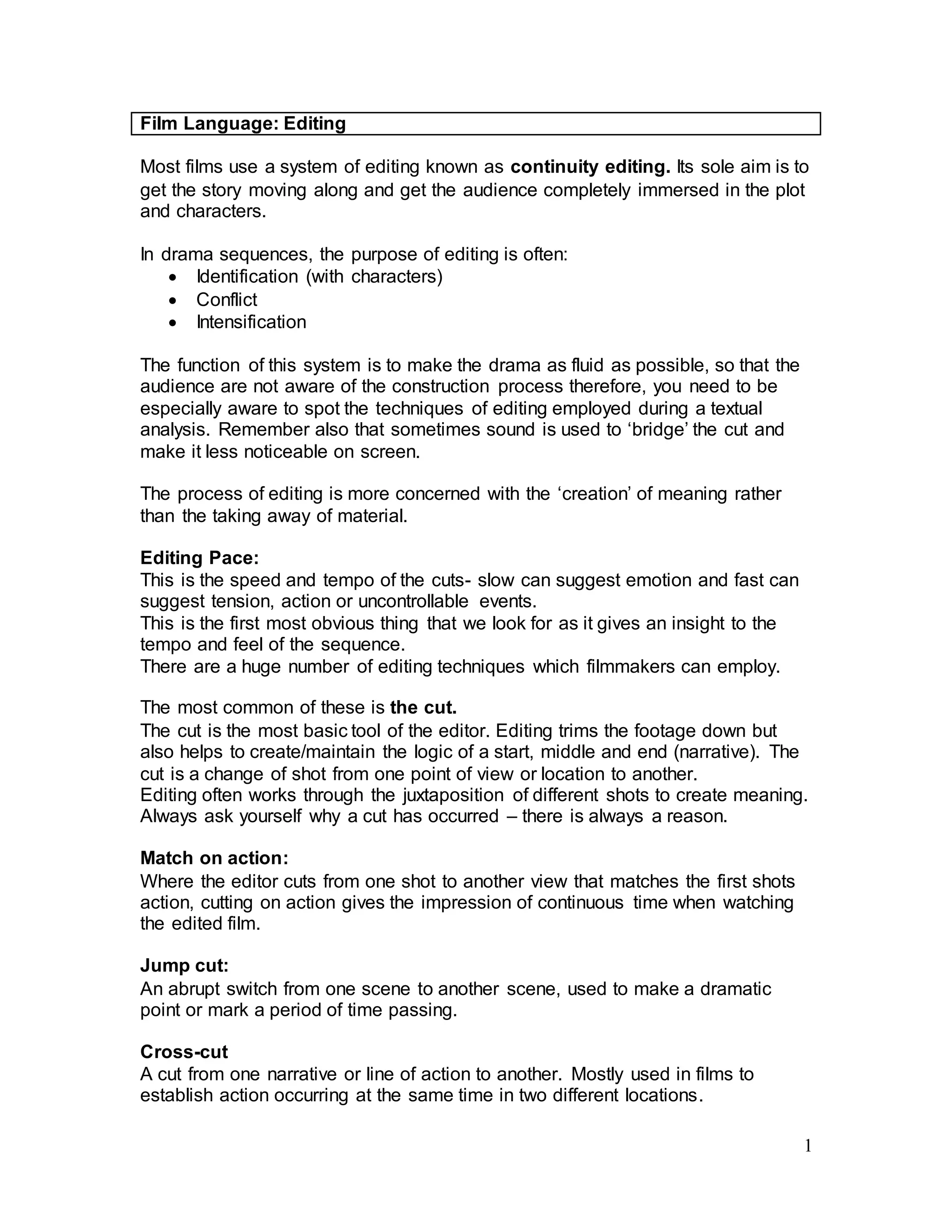 Most films use continuity editing to seamlessly move the story along and immerse viewers in the plot. The purpose of editing includes identifying with characters, creating conflict, and intensifying drama. Editing aims to make the story fluid so viewers are unaware of its construction. Common editing techniques include cuts, match cuts, jump cuts, cross-cuts, cutaways, reaction shots, dissolves, and wipes. These techniques are used to transition between shots and scenes, establish relationships, mark the passage of time, and guide audience reactions. Editing pace and techniques like montages are used to convey emotion, tension, and meaning.