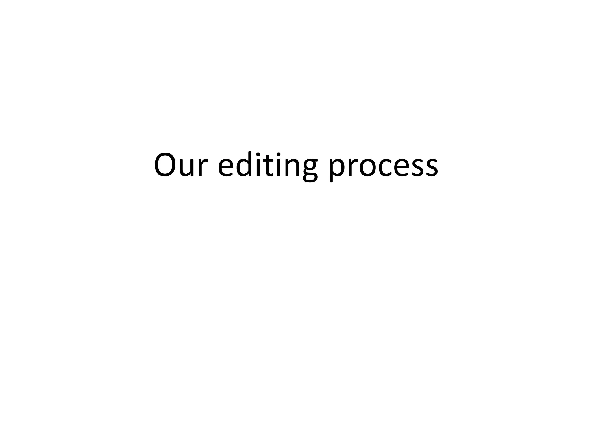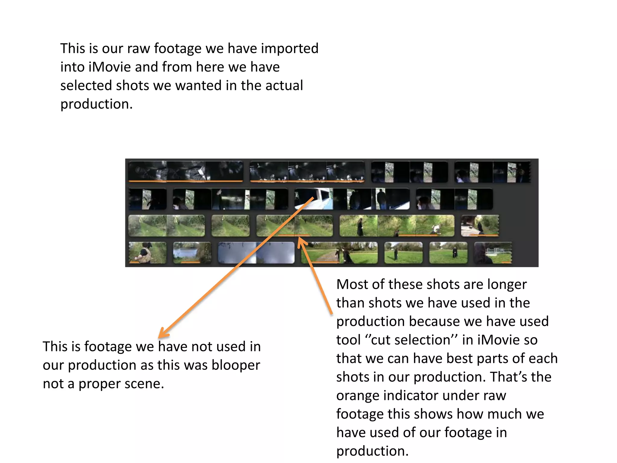 Our editing process involves selecting shots from raw footage in iMovie, cutting them to the best parts for the production using the cut selection tool. We add titles, transitions between shots, and royalty-free music to the production timeline. After effects are used to add elements like muzzle flashes matching the character shooting. Individual edited scenes are rendered and saved as MOV files to import into the final production in iMovie.