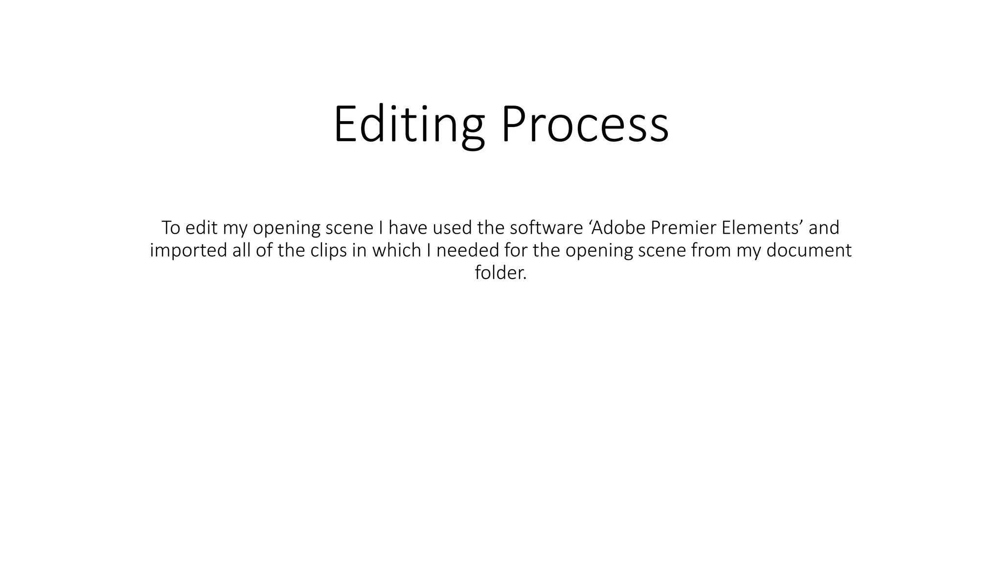 The document describes the filmmaker's editing process for creating an opening scene using Adobe Premier Elements. They imported clips, created a production company logo with a girly, eye-catching theme, and included a variety of shots like close-ups and zooms. The filmmaker then arranged the clips in order, cropped them to be short and snappy, adjusted clip speeds to fit the music, and added text with information. Finally, they recorded and edited in a voiceover, ensuring it could be heard over the soundtrack by lowering the volume during the voiceover.