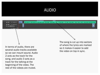 The document discusses the various editing techniques used in Adobe Premiere Pro to create a music video. Audio tracks were used for the song and talking segments. Video clips were filtered with black and white and tints, split into four sections on the screen using key frames, and transitioned from corners to the center. Key frames were also used to fade clips from black and white to color. Speed adjustments changed the pace of some clips. Overlapping shapes and double exposure effects were added to clips.