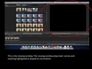 This document provides an overview of the editing process in Final Cut Pro. It describes key areas of the interface including the viewing window for playback, the footage window for imported media, and the timeline for assembling and editing clips. It also points out tools for imports, selections, transitions and sound editing, allowing for an organized editing workflow in the software.
