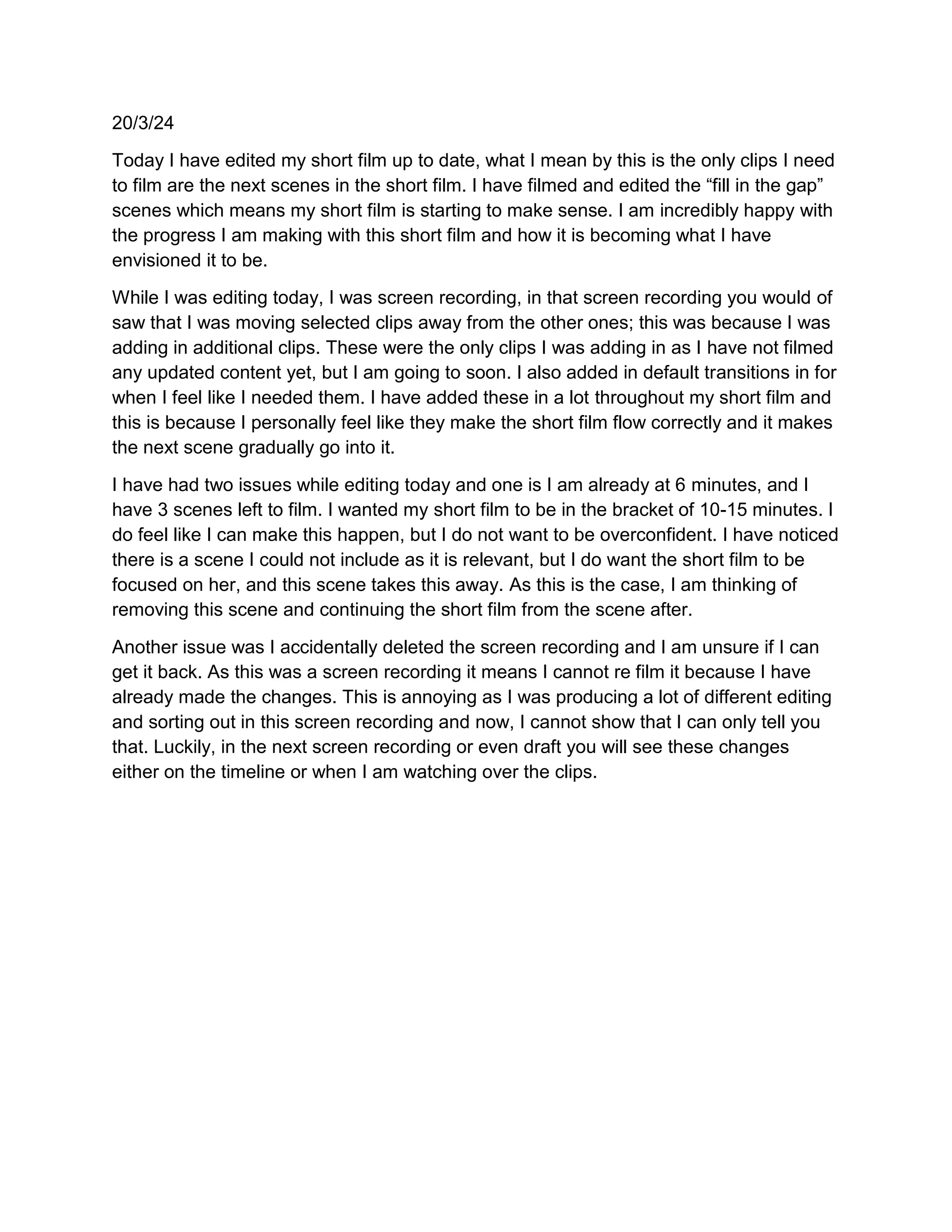 The filmmaker has progressed significantly with the editing of their short film, completing 'fill in the gap' scenes and adding transitions for flow. However, there are concerns about the total length being at 6 minutes with three scenes left to film, aiming for a final duration of 10-15 minutes. Additionally, a screen recording of the editing process was accidentally deleted, causing frustration as it documented important changes.