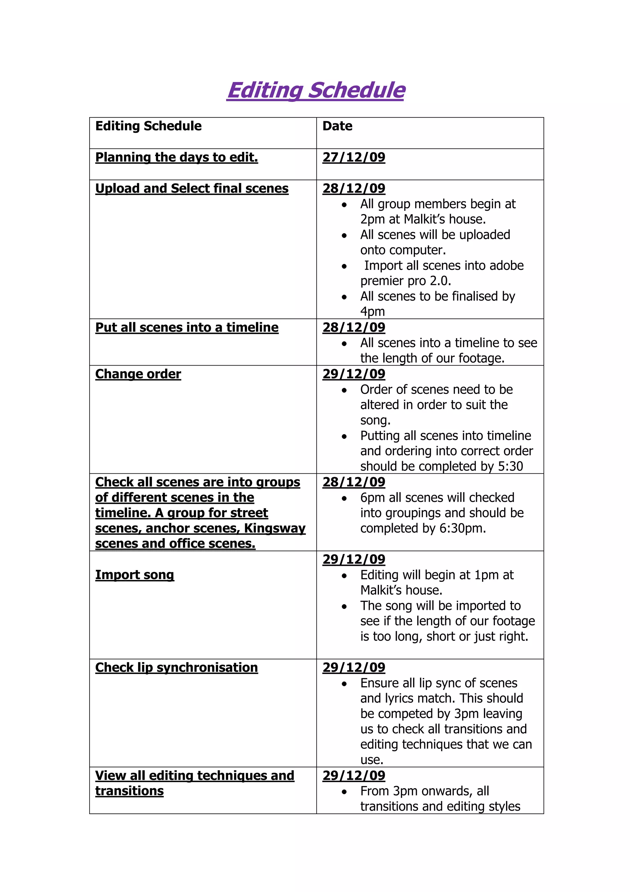 1) The document outlines an editing schedule for a group project taking place from December 27th to January 12th.