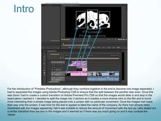 1) The document discusses editing sound and clips for a film introduction called "Predator Productions". It involved separating panther images in Photoshop and creating a custom transition in Premiere Pro for the images to slide in.