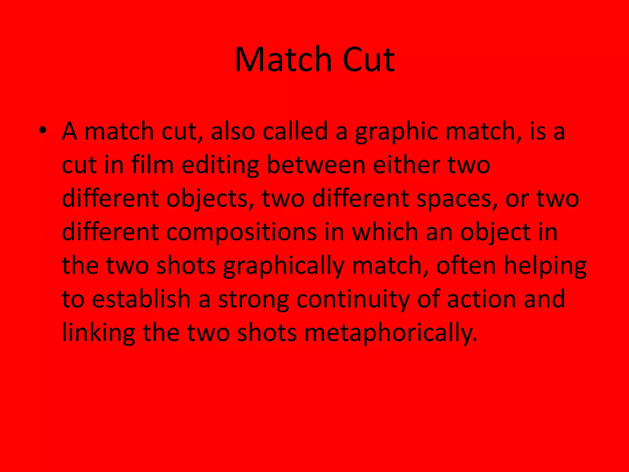 1) A match cut is an edit between two shots where an object or space matches graphically to establish continuity of action.
