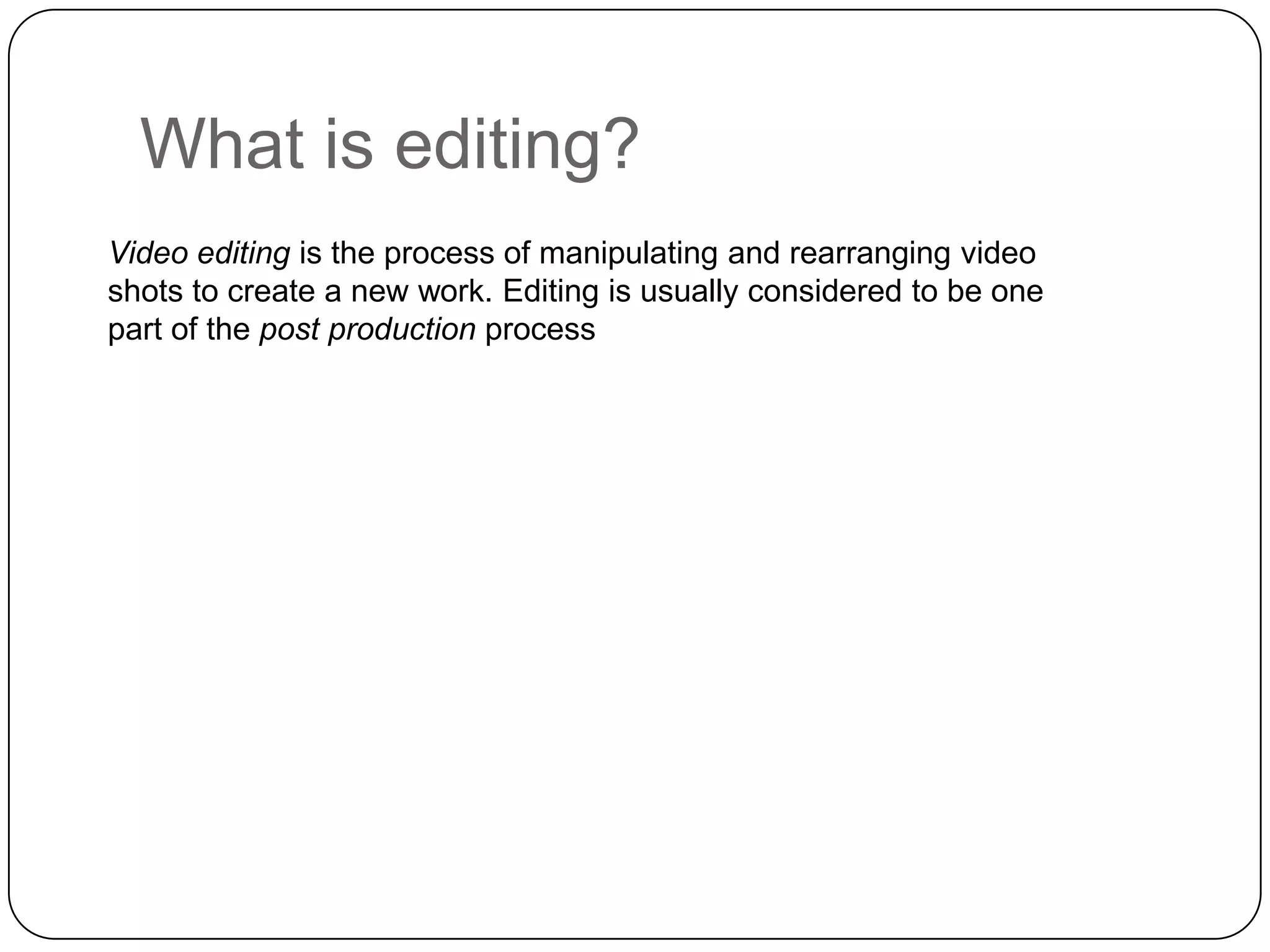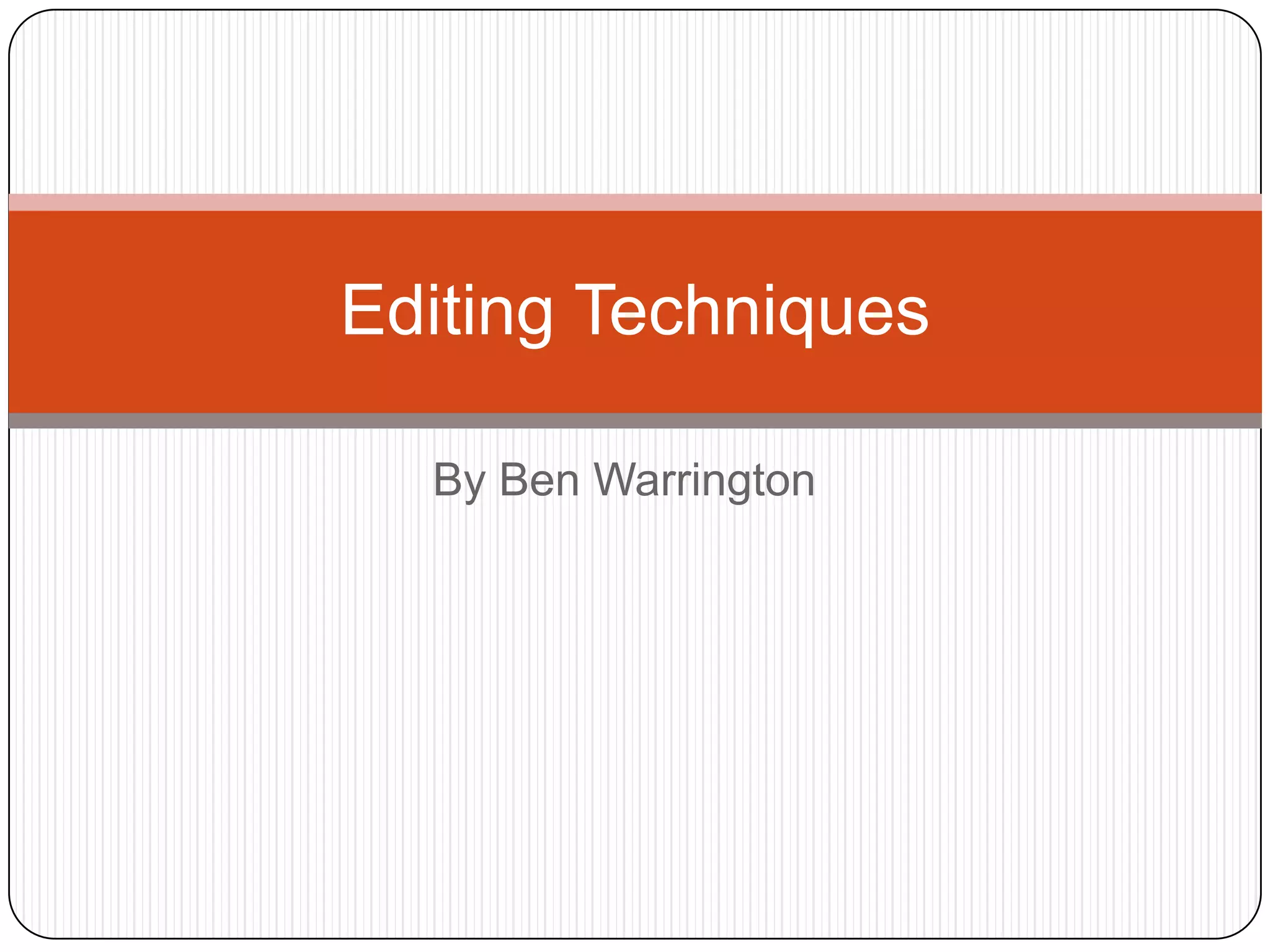 This document discusses various editing techniques used in video production. It begins by defining editing as the process of manipulating and rearranging video shots. It then outlines common goals of editing such as removing unwanted footage, choosing the best footage, creating a flow, and altering style/pace. Specific techniques are then defined, including continuity editing to maintain consistent visual elements, jump cuts as abrupt transitions, using credits to acknowledge production staff, cross cutting between simultaneous actions, cutaways to add visual interest, and match cuts between graphically similar shots.