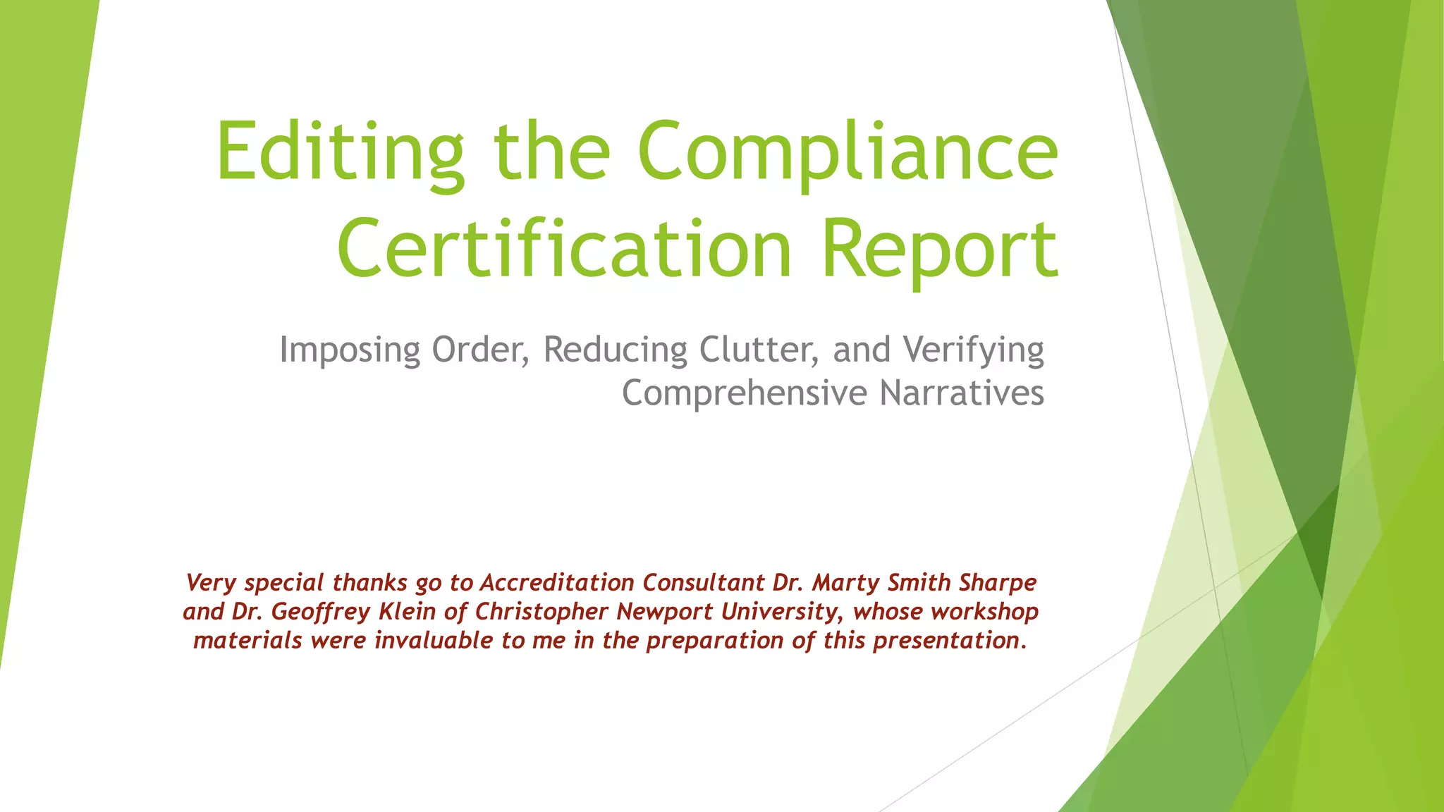 This document provides tips for writing concise and effective narratives for accreditation compliance certification reports. It discusses deconstructing standards to identify their scope and aspects, common shortcomings to avoid, and tips for crafting high-quality narratives. Specifically, it recommends identifying the scope of each standard upfront, addressing each aspect in turn with relevant evidence, and maintaining unity and coherence within and between narratives. The overarching goal is to provide all necessary information to demonstrate compliance for reviewers in a clear and straightforward manner.