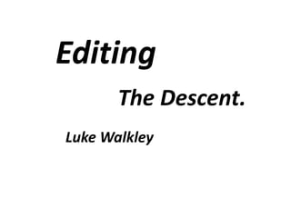 This document discusses the editing techniques used in a car crash scene from the film The Descent. It analyzes various shots from different perspectives and how they were edited together, including shots inside the car to establish characters, shots of the approaching van edited with shots of the driver looking away, and computer generated imagery of poles and blood used for safety reasons. The editing builds tension and puts the viewer in the daughter's perspective during the crash.
