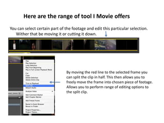 The document discusses editing using iMovie. It explains some of the key tools in iMovie, including splitting clips, adding sound effects, adjusting audio and visual settings, and cropping/rotating footage. It then provides an evaluation of using iMovie for a school project, noting that the editing process was complicated due to miscommunication between group members and a lack of enthusiasm to meet after school to work on edits. While the editing took a long time, the document concludes that the group used their time productively and the final edited footage was acceptable.