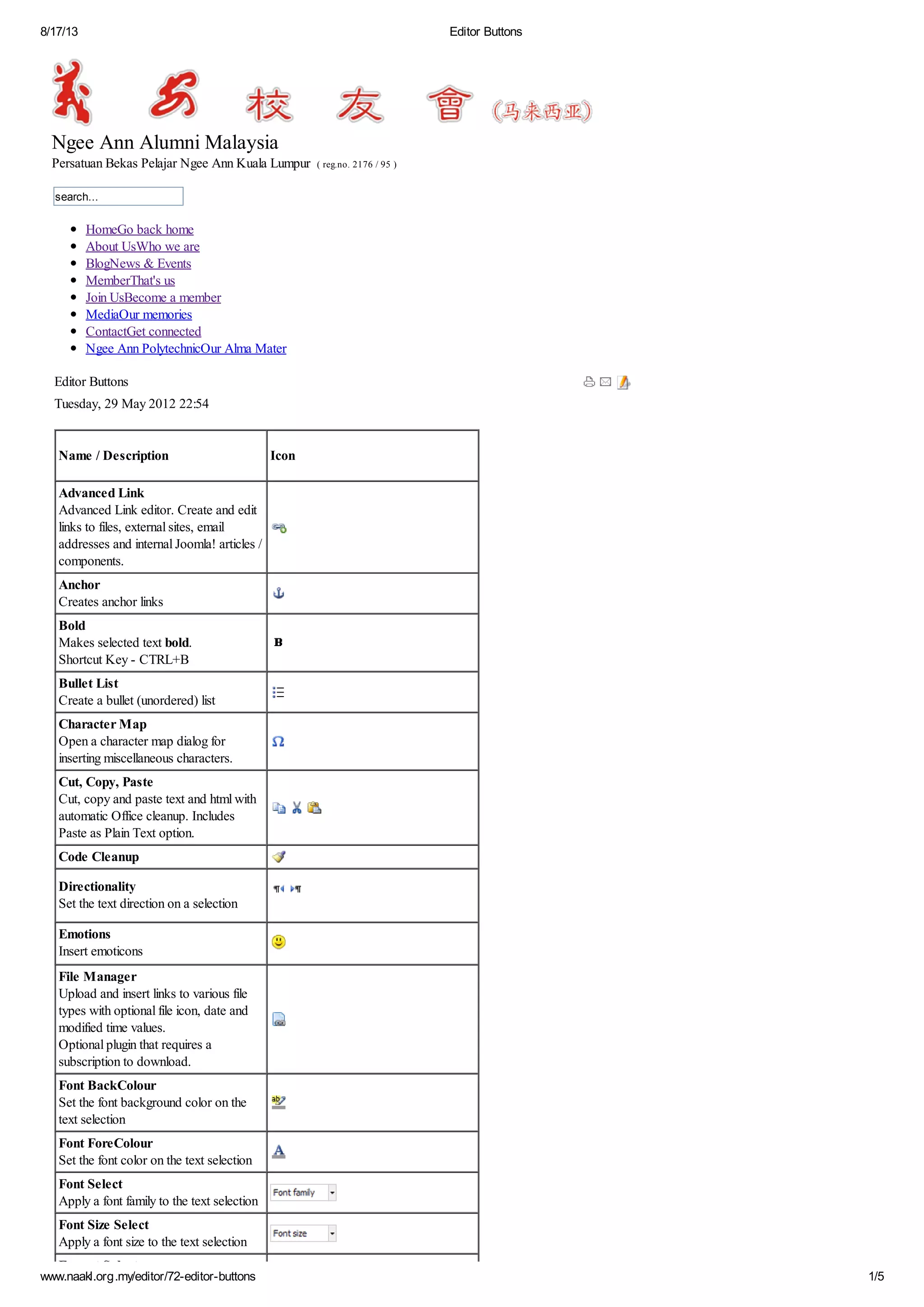 This document lists and describes various editing buttons available in the Joomla content editor. There are over 50 buttons described, including buttons for formatting text like bold, italic, underline; inserting lists, links, images; changing text alignment; and other common editing tools. The buttons allow editing and formatting content directly in the editor interface.