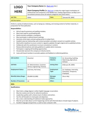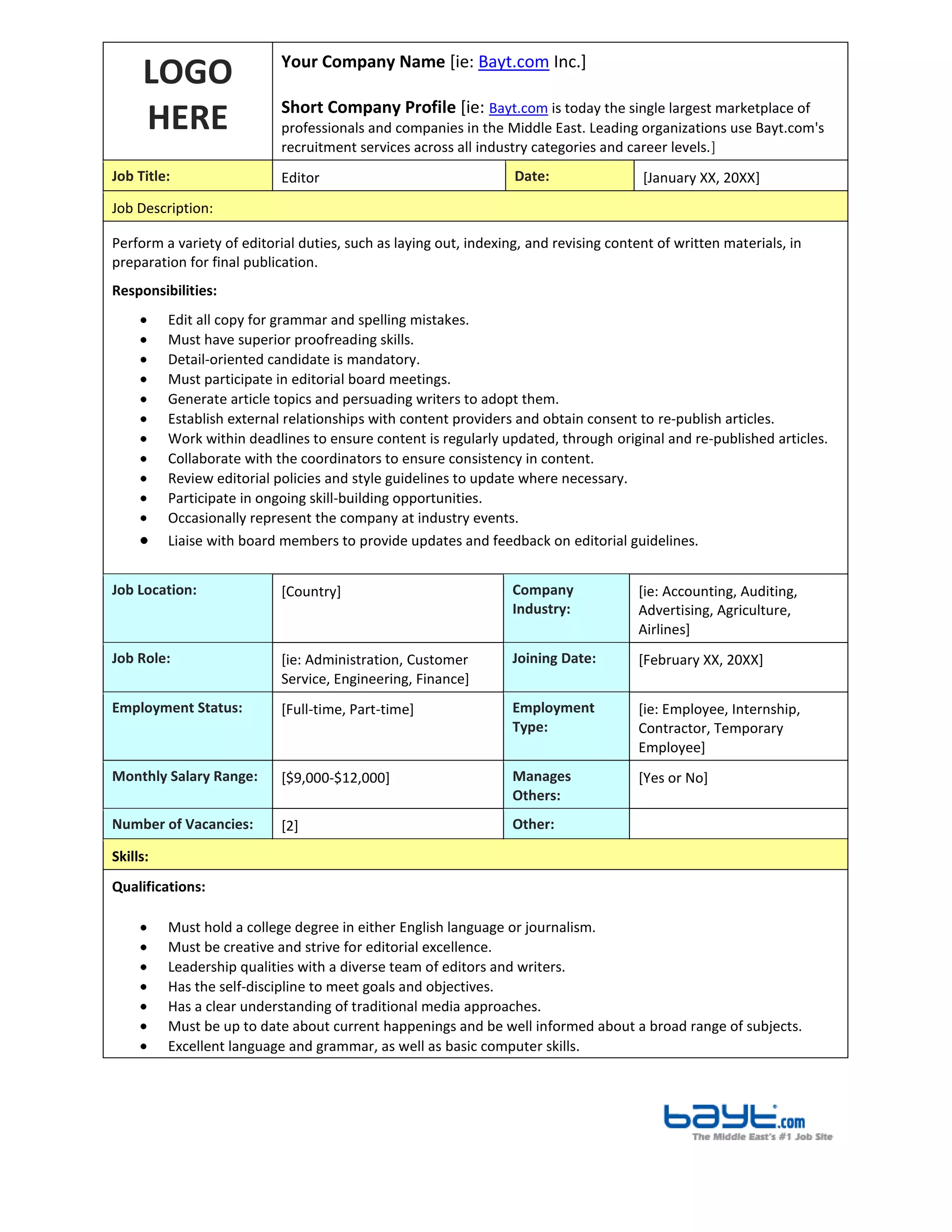 This document outlines a job description for an Editor position at a company, highlighting responsibilities such as editing copy for grammar, generating article topics, and updating editorial policies. Candidates must have a college degree in English or journalism, possess superior proofreading skills, and have a leadership background. The role is full-time with a salary range of $9,000 to $12,000 and requires 7-10 years of experience.