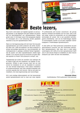 TV Trade Magazine since 1981 Alexander Wiese Publisher alex@tavmag.com HQ in Munich, Germany Address TELE-audiovision International, PO Box 1234, 85766 Munich-Ufg, GERMANY/EUROPE Editor-in-Chief Alexander Wiese, alex@tavmag.com Published by TELE-audiovision Magazine GmbH, Aschheimer Weg 19, 85774 Unterfoehring, GERMANY/EUROPE Design Németi Barna Attila Advertising www.TELE-audiovision.com/ads/ or email to alex@tavmag.com Hard Copy Subscription www.TELE-audiovision.com/subscription/ Hard Copy Subscription by Courier Service Send Order to subscription@tavmag.com Copyright © 2013 by TELE-audiovision ISSN 2195-5433 TELE-satellite was established in 1981 and today is the oldest, largest and most-read digital tv trade magazine in the world. TELE-satellite is seen by more than 350,000 digital tv professionals around the world and is available both in printed form and online. www.TELE-audiovision.com Beste lezers, Nog nooit is het meten van digitale signalen zo eenvou- dig geweest. In de afgelopen drie jaar hebben we gezien hoe de beschikbaarheid van signaalanalysers steeds groter werd. In het begin waren het aangepaste digitale TV ontvangers die in een behuizing werden geplaatst waardoor ze op een signaalanalyser leken. Maar zo is het tegenwoordig echt niet meer! De nieuwste signaalanalysers zijn échte analysers die échte resulta- ten laten zien. Zelfs het bedienen van deze analysers is almaar eenvoudiger geworden en, nog verrassender, de metingsprecisie is gestaag verbeterd terwijl tegelijker- tijd de prijzen van deze signaalanalysers steeds lager werden. Is er nog een excuus te verzinnen om geen digi- tale signalen te meten? Het antwoord is simpel: nee. Tegelijkertijd zijn echter de vereisten voor iedereen die te maken krijgt met het installeren van digitale TV toe- genomen. Omdat er geen excuses meer zijn om iets correct te installeren en om de installatie te voorzien van een formeel testprotocol, moet iedere installateur en systeemontwerper veel meer aandacht besteden aan correcte waardes dan ooit tevoren. Wat je ook plant en installeert, het moet tegenwoordig veel voorzichtiger. Dit is een prettige bijkomstigheid van het toenemende aantal signaalanalysers dat nu meer een meer digitale TV professionals zich kunnen veroorloven. Als gevolg daarvan verbetert de kwaliteit van hun werk. Dat is ook wel nodig, omdat de complexiteit van de hedendaagse technologie dit vereist. Het is een parallelle technolo- gische ontwikkeling: veel van de hedendaagse digitale TV technologieën worden op de best mogelijke manier toegepast in hedendaagse signaalanalysers. In elke editie van TELE-audiovision presenteren wij een geactualiseerd overzicht van alle momenteel beschik- bare signaalanalysers. Kijk maar eens in deze editie vanaf pagina 128. Zelfs al U al een signaalanalyser heeft zijn er veel nieuwe dingen te ontdekken en deze nieuwe analysers zijn vaker wel dan niet betaalbaar. Alexander Wiese Hoofdredacteur TELE-audiovision Internationaal