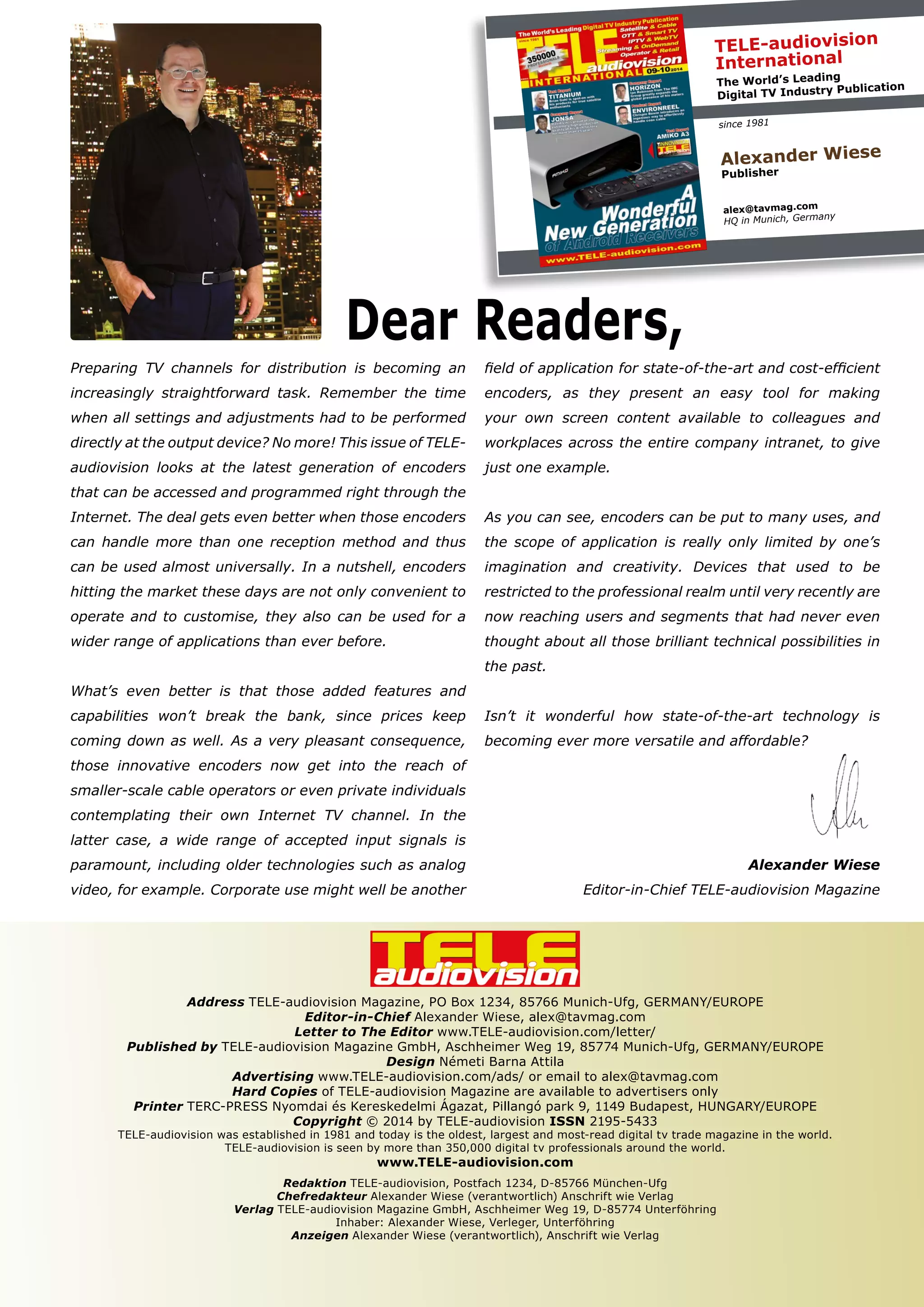 This issue of TELE-audiovision magazine focuses on the latest generation of encoders that can be accessed and programmed remotely through the internet. These encoders can handle multiple reception methods, making them more versatile for a wider range of applications. Additionally, prices of encoders continue to decrease, putting innovative models within reach of smaller cable operators and individuals looking to start their own internet TV channels. The magazine discusses how encoders can now be used for many purposes, limited only by one's imagination, as the technology becomes more advanced and affordable.