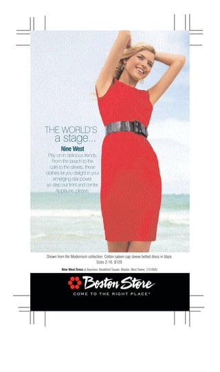 This document advertises a cotton sateen cap sleeve belted dress from the Modernism collection by Nine West that is available in sizes 2-16 for $129 at several Bayshore, Brookfield Square, Mayfair, and West Towne locations. The dress lets the wearer enjoy emerging trends from the beach to cafes to streets with emerging star power.