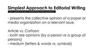 The document outlines the structure and types of editorial writing, emphasizing the importance of articulating a clear opinion on relevant issues. It discusses the various components of an editorial, including introduction, body sections supporting the writer's view, and conclusion. Additionally, it highlights different purposes for editorials, such as informing, explaining, criticizing, and persuading readers.