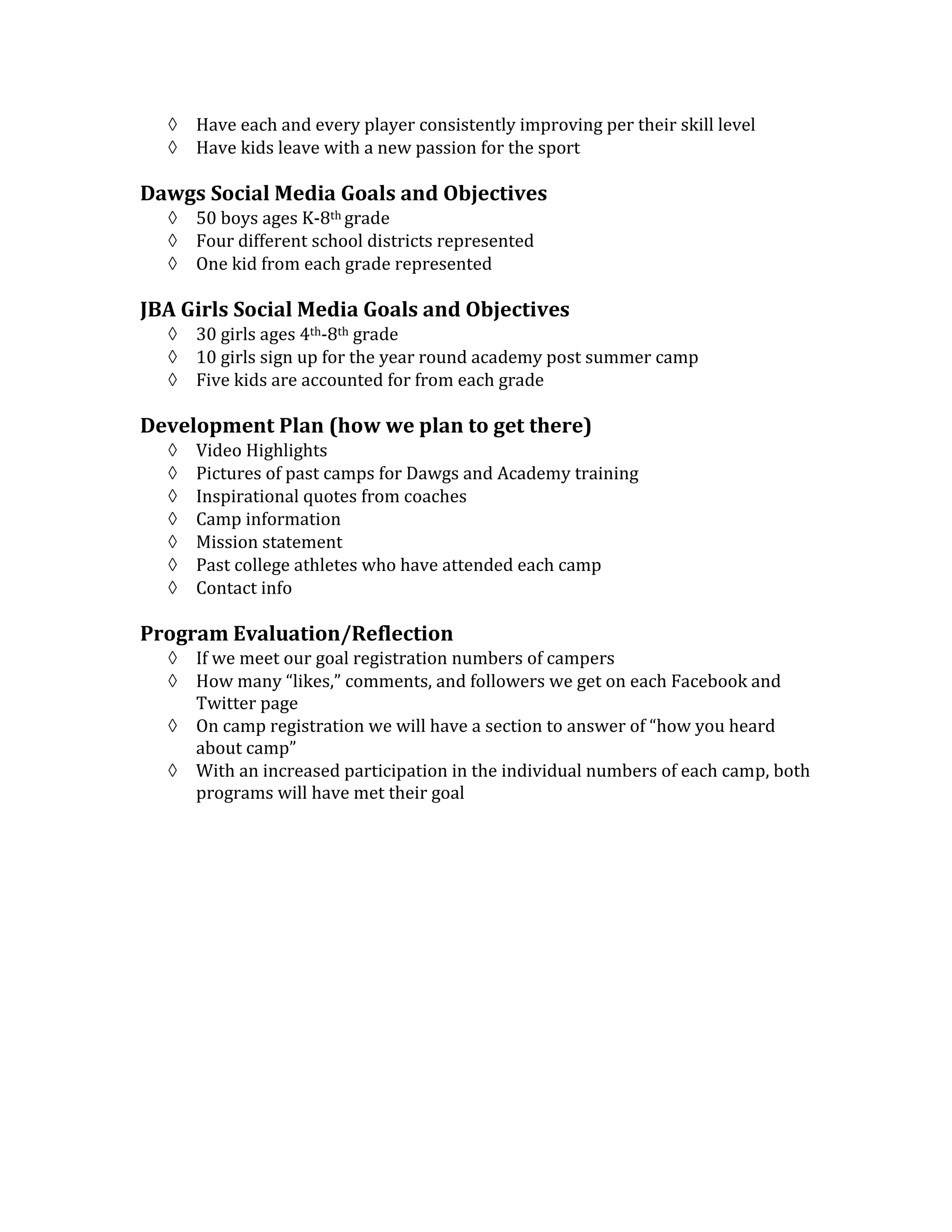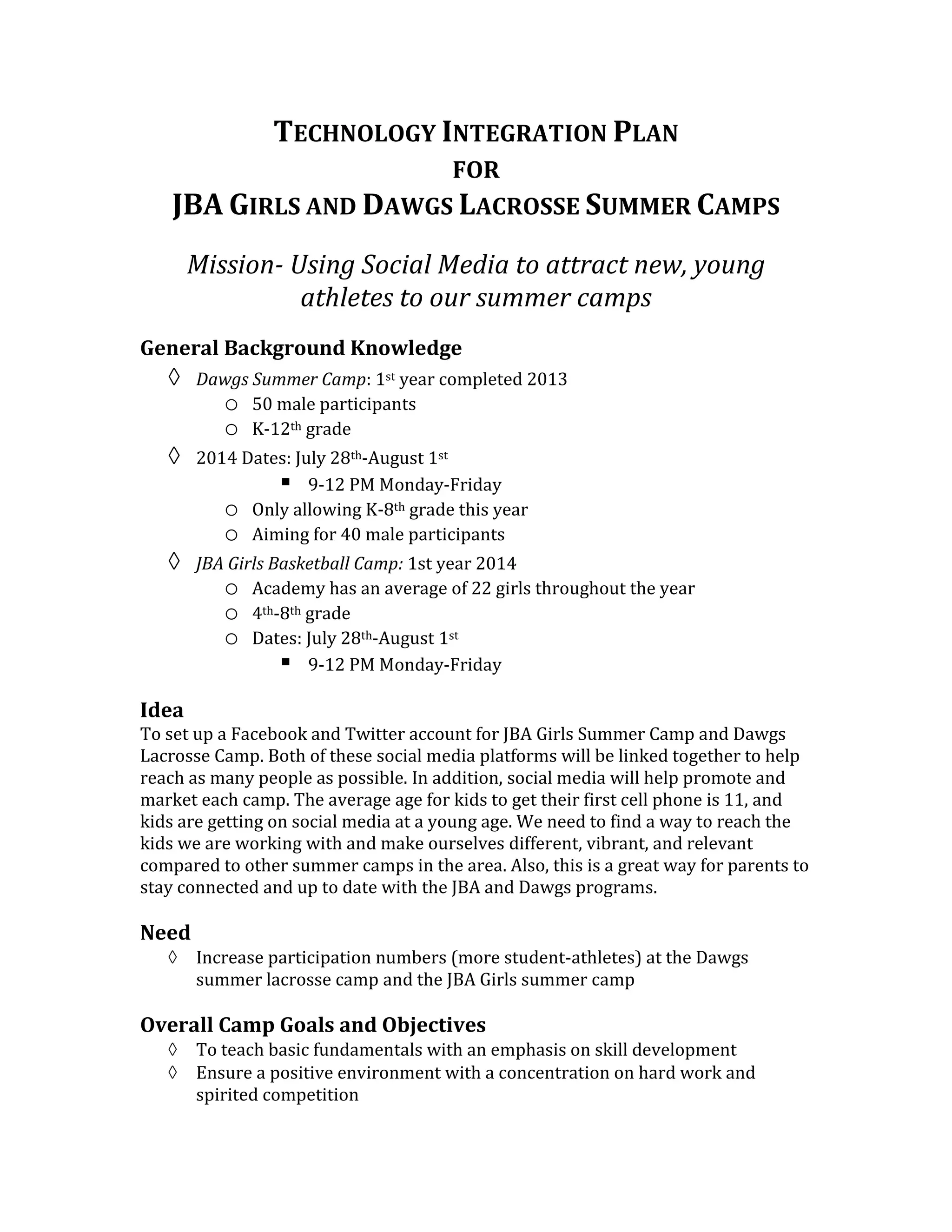 The technology integration plan outlines goals to use social media to promote the JBA Girls and Dawgs Lacrosse summer camps. The plan calls for setting up Facebook and Twitter accounts to market the camps and attract new young athletes. The goals are to increase participation numbers at each camp through the social media presence, with specific targets for numbers of campers, age ranges represented, and geographic diversity. The social media development plan details the types of content that will be shared, and program evaluation will measure registration numbers and engagement on the social platforms.