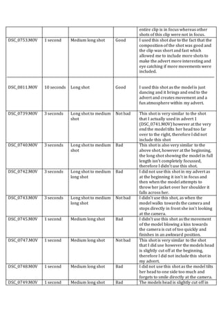 The document reviews 28 video shots taken for a fashion advertisement. It provides the name, length, shot type, and quality rating for each video, along with comments on why certain shots were or were not used. The best shots incorporated smooth camera movements, clear focus on the model, natural poses and facial expressions, and limited background. Shots with technical issues like blurriness, poor lighting, or unnatural poses were deemed not suitable for the final advertisement.