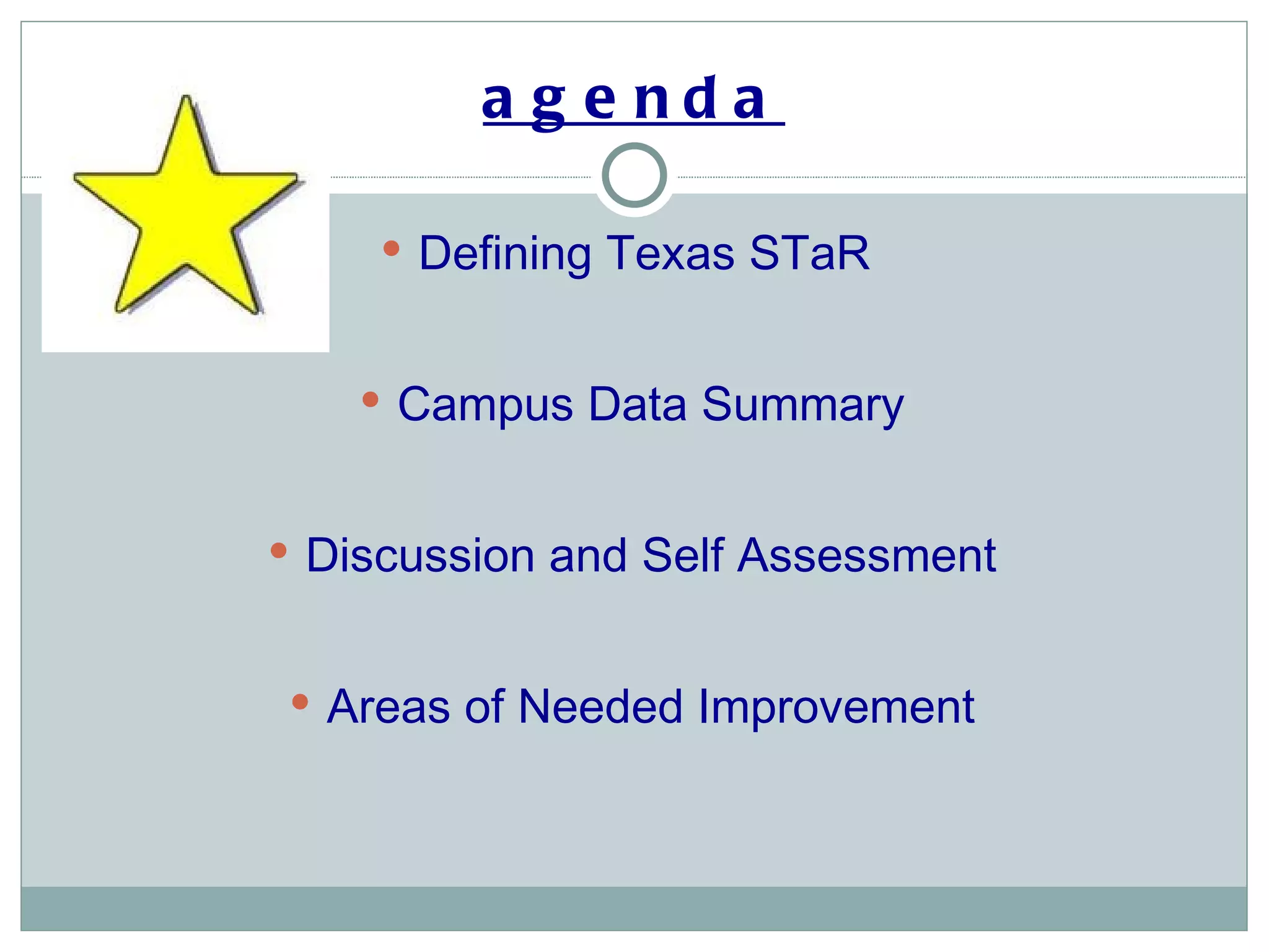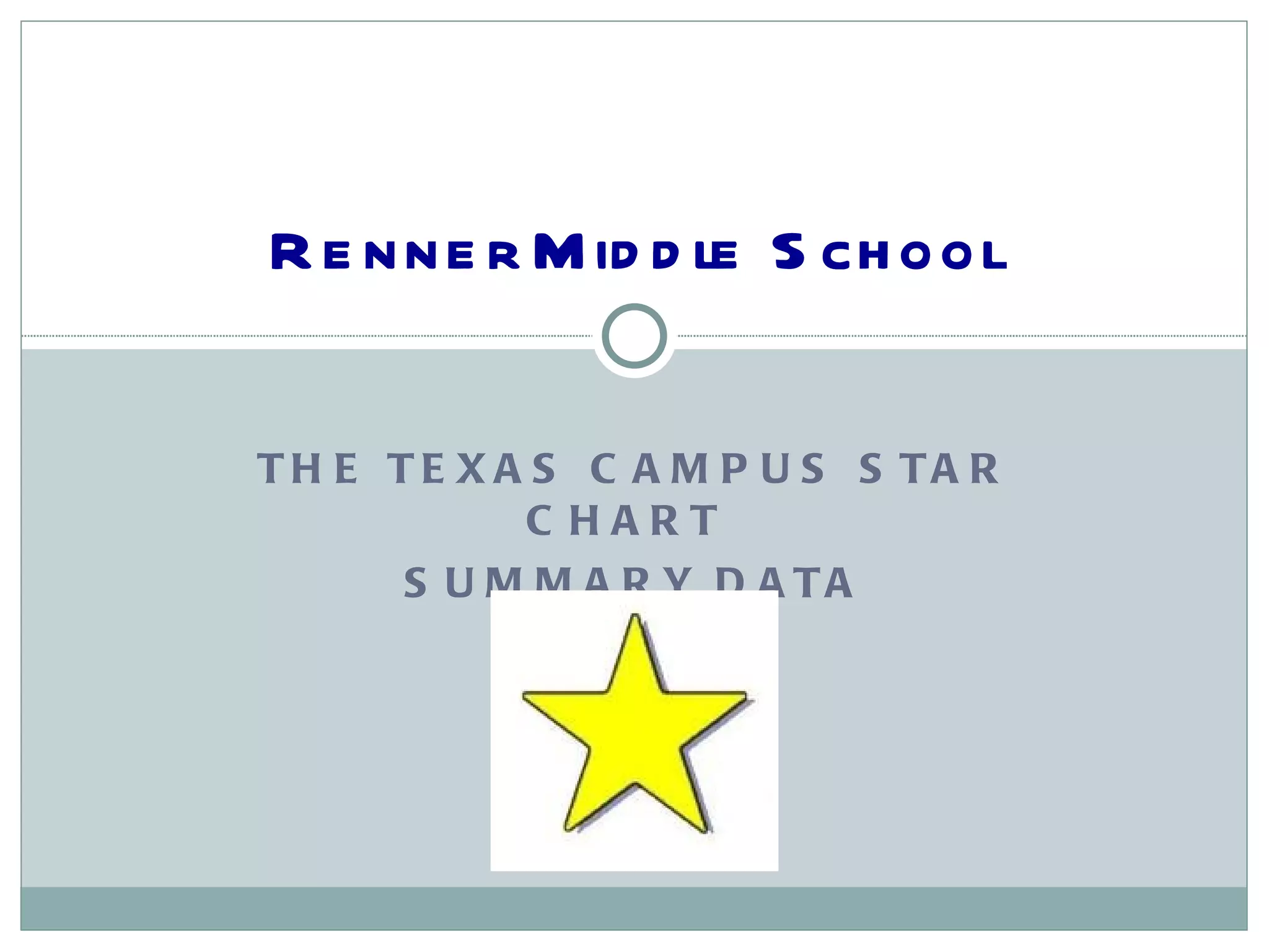 The document summarizes Renner Middle School's data from the Texas STaR Campus technology readiness chart over three years from 2006-2009. It shows that the school scored in the "Advanced" range for Teaching and Learning and Educator Preparation and Development but leadership scoring declined slightly. Infrastructure for Technology remained at the "Target" level. The document identifies that teachers have shown little growth and lists areas of needed improvement to discuss for personal and campus benefits.
