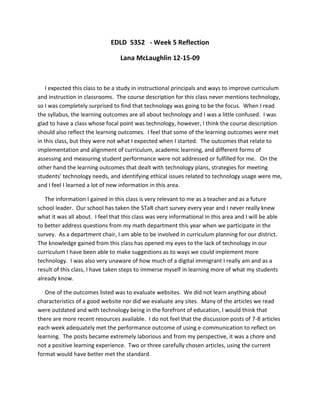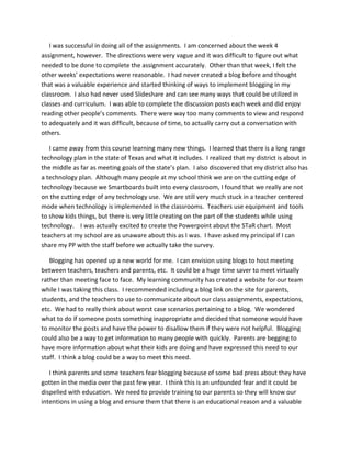 This student took a class about educational leadership that was supposed to focus on instructional principles and curriculum, but ended up focusing primarily on educational technology instead. While the student learned a lot about technology planning and implementation, some of the stated learning outcomes around curriculum and assessment were not addressed. The student felt some assignments, like evaluating websites, were not adequately covered. Overall, the student found the class very informative in learning about technology use in their school and state, and how they can help increase integration of technology into classroom instruction and communication with parents.