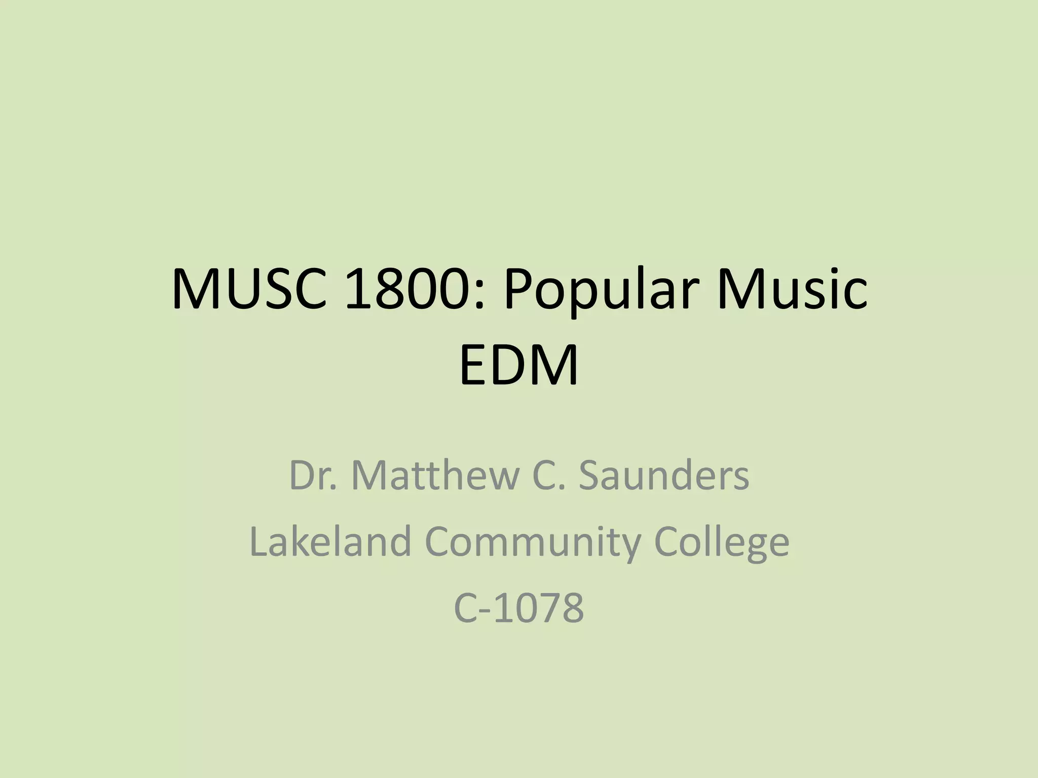 This document discusses the rise of electronic dance music (EDM) from the 1990s to the present. It outlines key developments like music becoming untethered from physical formats, the influence of reality television, and the declining relevance of the traditional music industry. Genres like techno, trance, drum'n'bass, and dubstep emerged from clubs and raves in the 1990s and utilized electronic-only instrumentation, with many current pop hits now influenced by these styles.