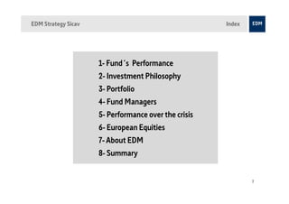 The EDM Strategy SICAV focuses on European equities, showcasing a consistent performance with higher returns and lower volatility compared to major indices through various market conditions. The investment philosophy emphasizes a long-term, bottom-up approach with concentrated stock picking, prioritizing quality, predictable businesses, and macro-trends. The fund is managed by a team of experienced professionals, and its strategy aims for outperformance while maintaining a defensive posture and high liquidity.