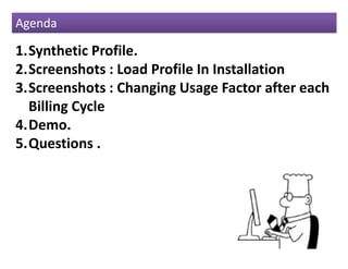 Synthetic profiles are used when no interval data is available to classify customer consumption patterns. They contain generated values based on predefined periods and day/annual profiles. For the demo, a pre-created synthetic profile will be allocated to a load profile in an installation along with a profile allocation role. The initial usage factor will be calculated. Billing runs will then be executed to see if the usage factor gets modified after each cycle, since dynamic modification factors prevent large jumps between seasons and maintain normal profile shapes. Questions are welcome at the end.