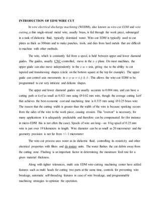 This document provides information about wire electrical discharge machining (WEDM or wire-cut EDM). It discusses that in WEDM, a thin brass wire is fed through the workpiece submerged in dielectric fluid, typically deionized water. The wire is held between upper and lower diamond guides that move in the X-Y plane and can cut intricate shapes. The process uses water to flush away debris, and wire diameters as small as 20 micrometers can be used to cut with precision of +/- 1 micrometer. Wire-cutting EDM is commonly used for hard metals and when low residual stresses are desired.