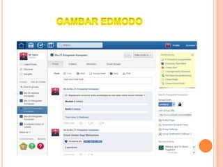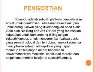 Edmodo adalah platform pembelajaran sosial yang dirancang untuk memfasilitasi interaksi antara guru, siswa, dan orang tua secara online. Platform ini memungkinkan guru untuk mengunggah materi pelajaran, menugaskan pekerjaan rumah, dan menilai siswa secara digital, sementara siswa dapat mengakses materi kapan saja dan berkolaborasi dengan teman sekelas. Edmodo hadir sebagai alternatif pembelajaran daring yang aman dan ter
