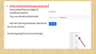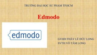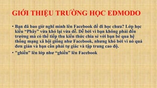 Edmodo là một nền tảng học tập trực tuyến tương tự như Facebook, nhưng được thiết kế cho giáo dục, cho phép giáo viên và học sinh chia sẻ tài liệu, ý tưởng và quản lý lớp học. Người dùng có thể đăng ký đơn giản và cần mật khẩu để tham gia các nhóm, đồng thời giáo viên có thể quản lý và giao tiếp với học sinh một cách chặt chẽ. Edmodo cũng cung cấp nhiều tính năng như kết nối giữa các giáo viên, lịch trả bài tập và phiên bản di động cho việc quản lý từ xa.